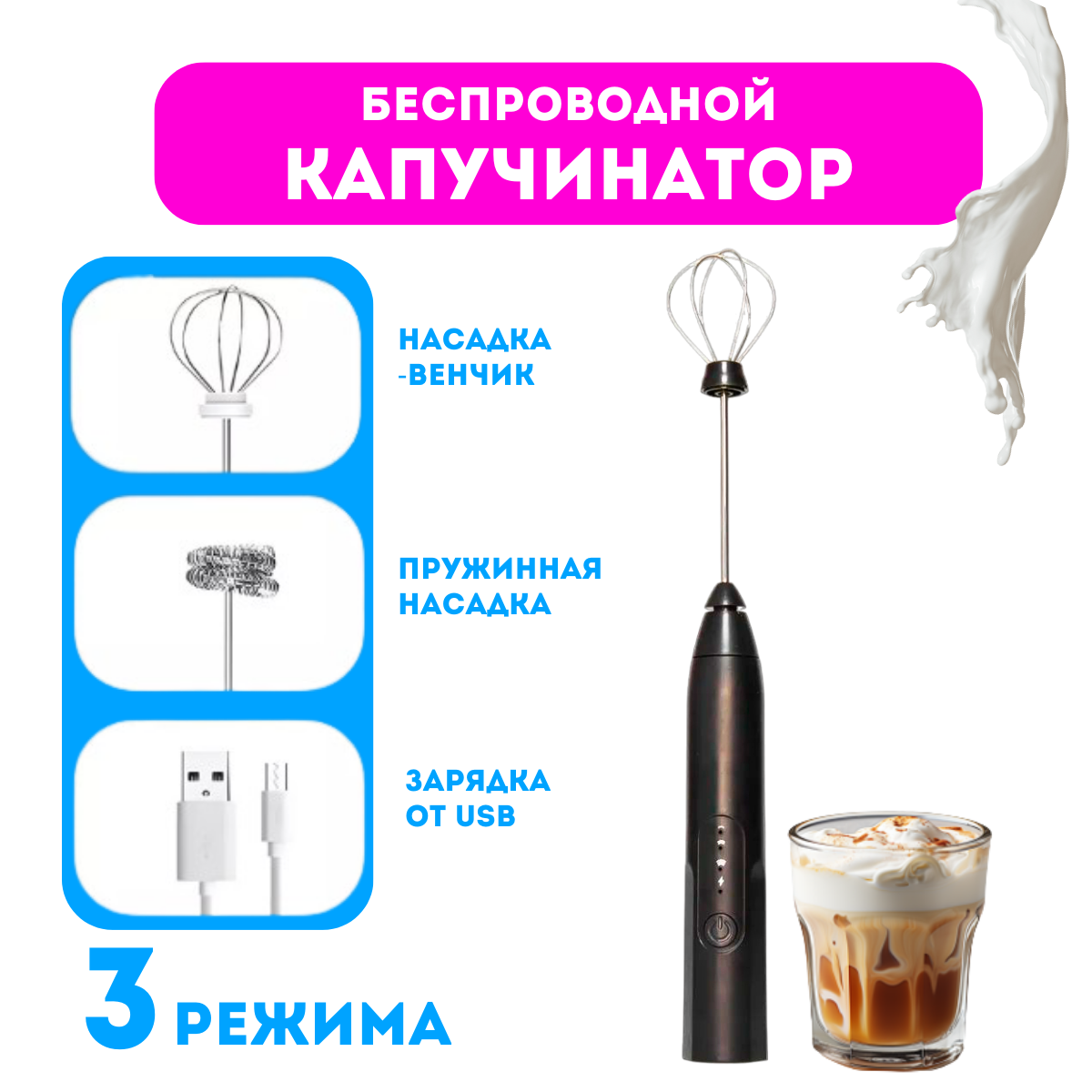 Беспроводной капучинатор для молока с USB зарядным устройством и двумя венчиками, 3 режима (черный) интересное: