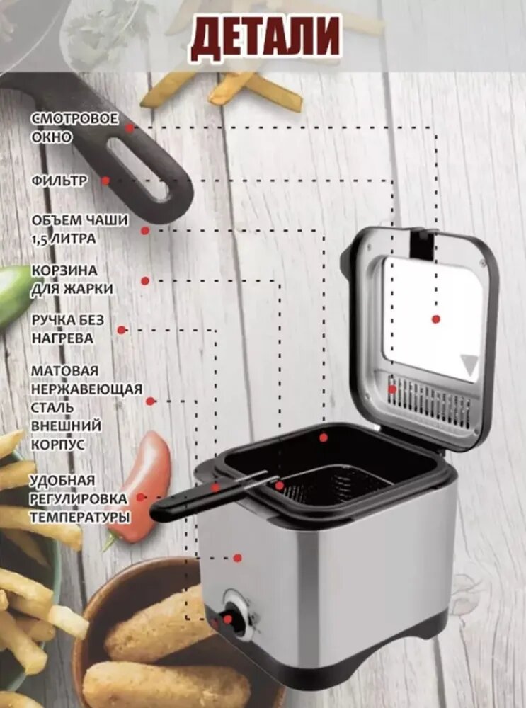 Фритюрница электрическая, 1.5 л, 6 режимов температуры, съемная чаша, серебристый