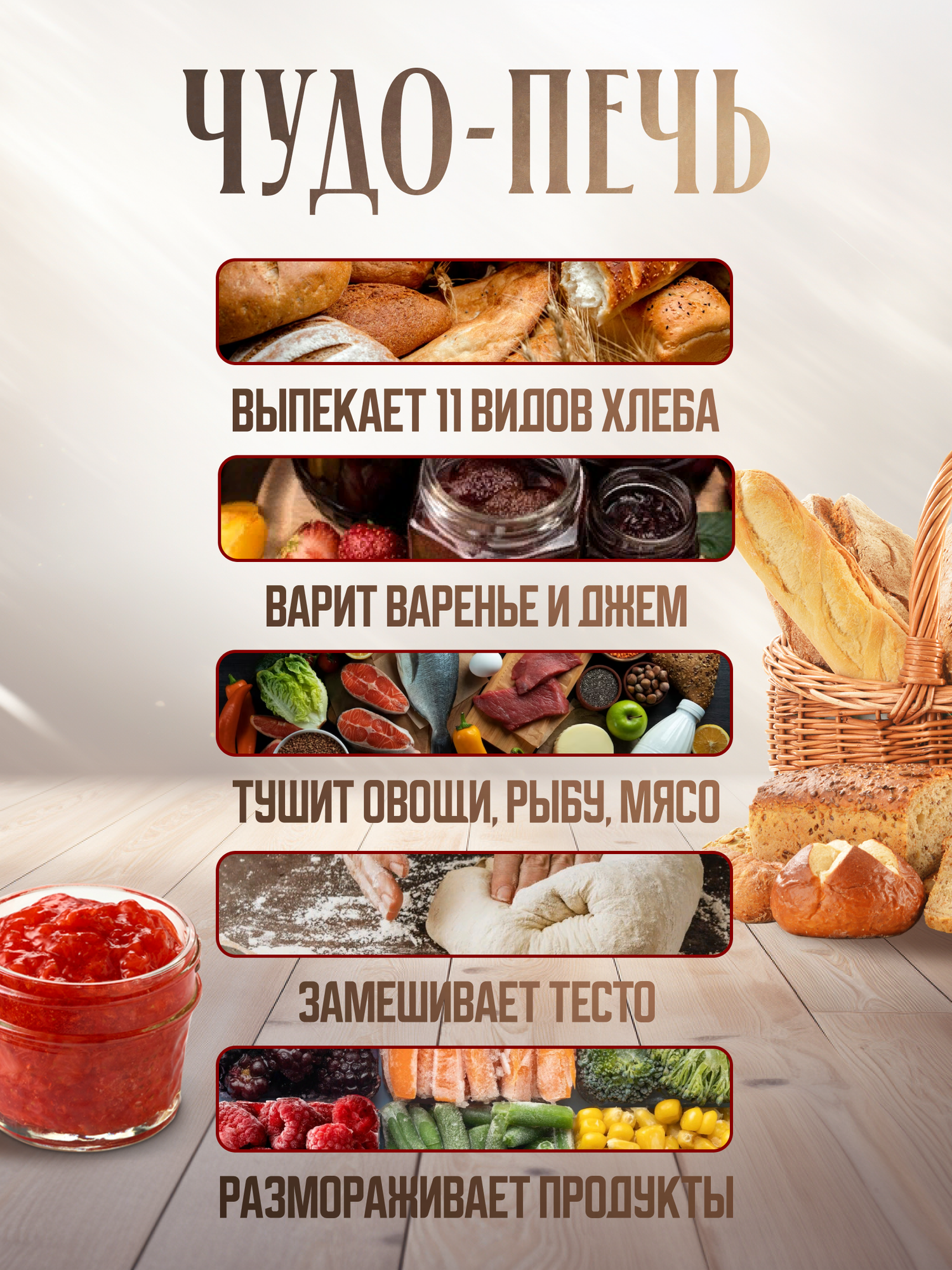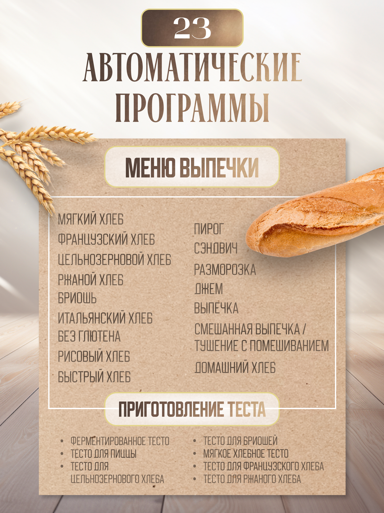 | Программы | безглютеновая выпечка / бездрожжевая выпечка / бородинский хлеб / варенье / замес теста / йогурт / кекс / пшеничный хлеб / ржаной хлеб / сладкая выпечка / французский багет / хлеб из муки грубого помола |