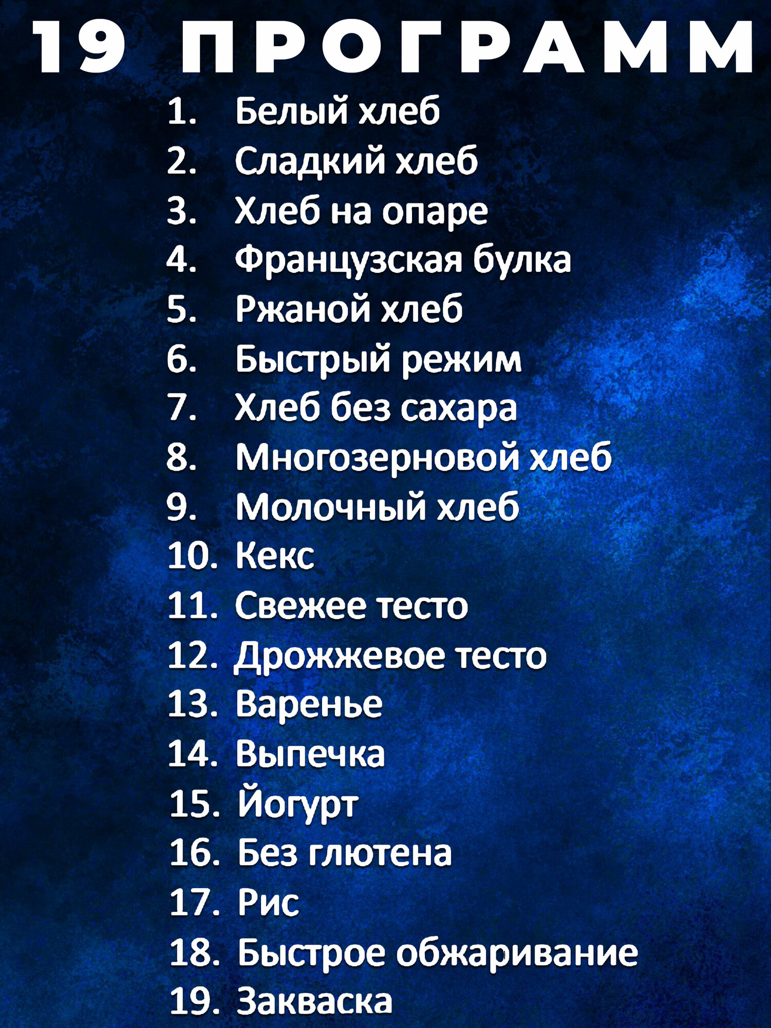 | Количество программ выпечки | 19 |