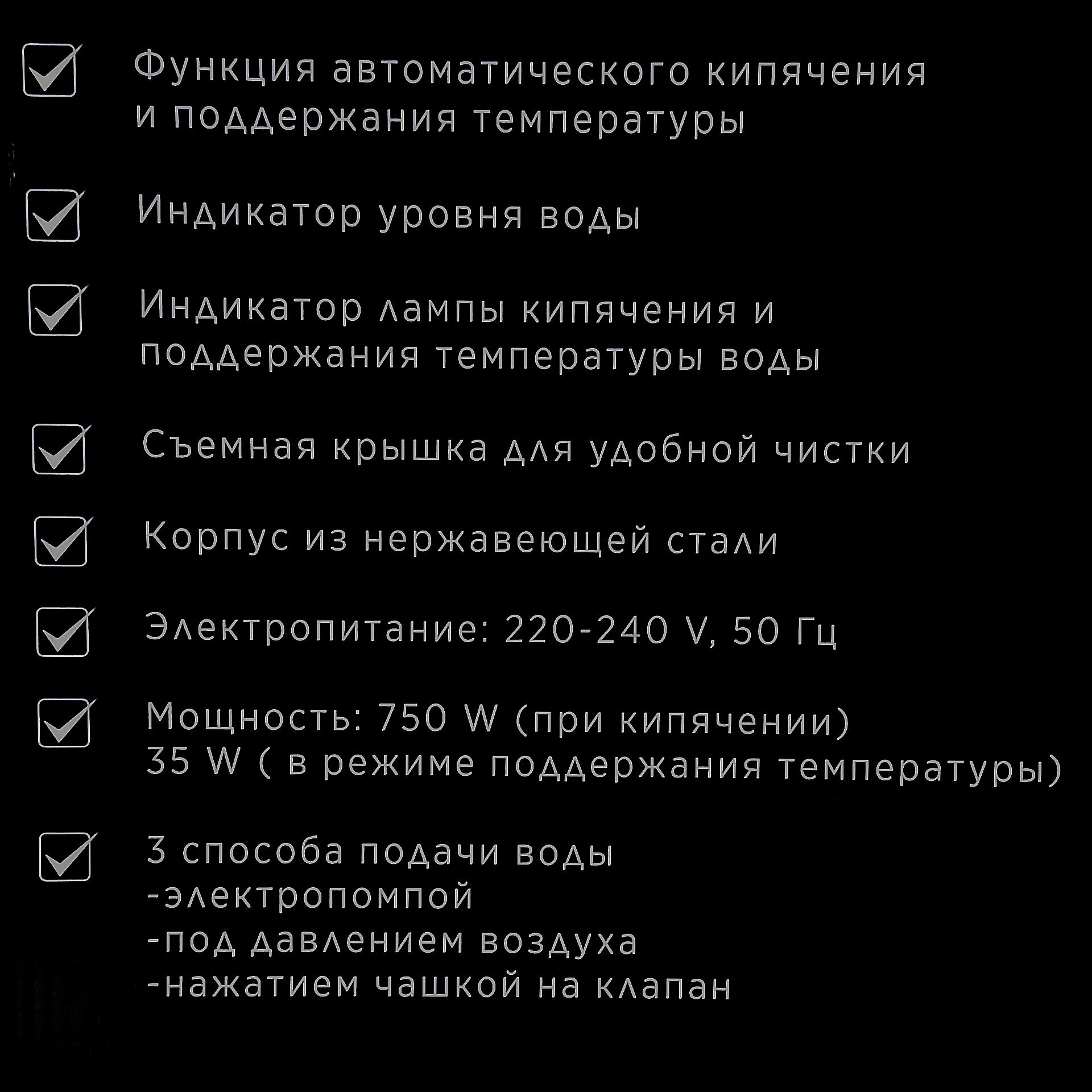| Особенности | двойные стенки / индикатор уровня воды / индикация включения / рисунок на корпусе / съемная крышка / терморисунок |