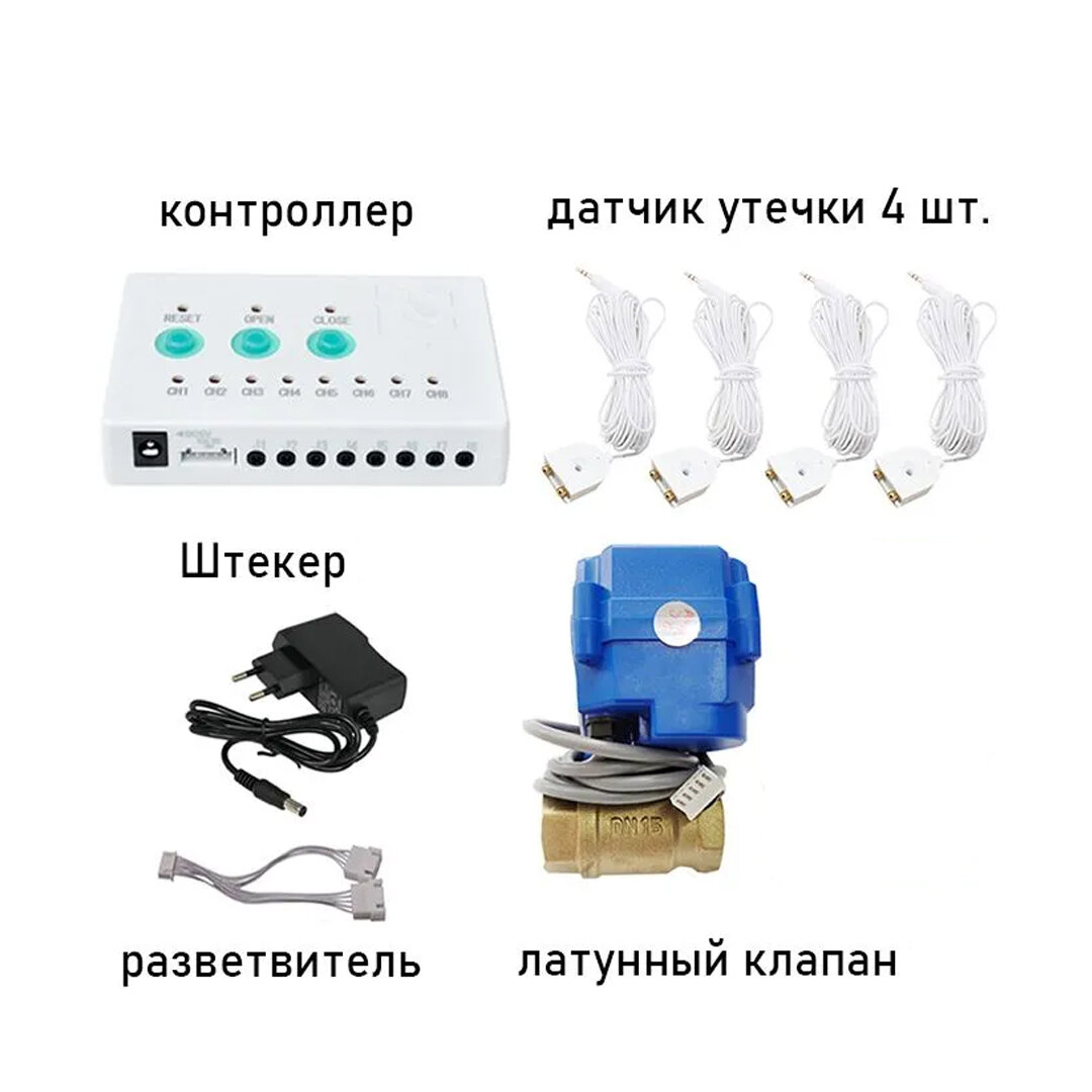 | Подробная комплектация | кран с электроприводом 1/2''; 4 датчика протечки воды; блок управления; адаптер питания |