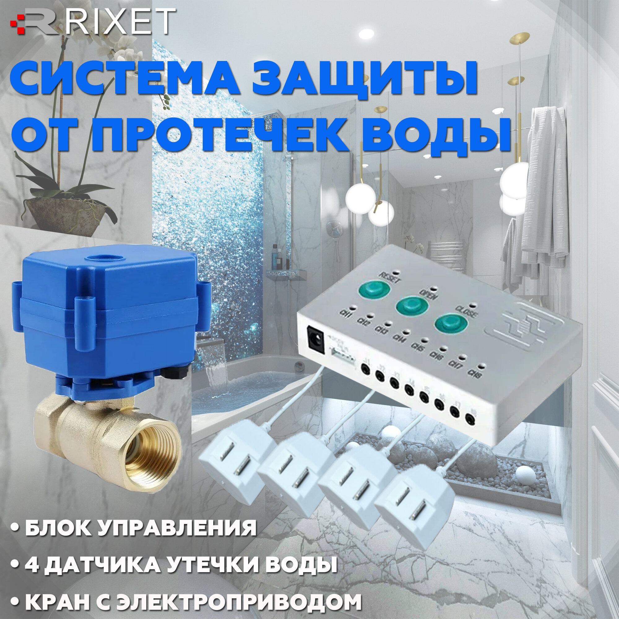Купить Система защиты от протечек воды Rixet 1/2", кран с электроприводом, 4 датчика, панель управления