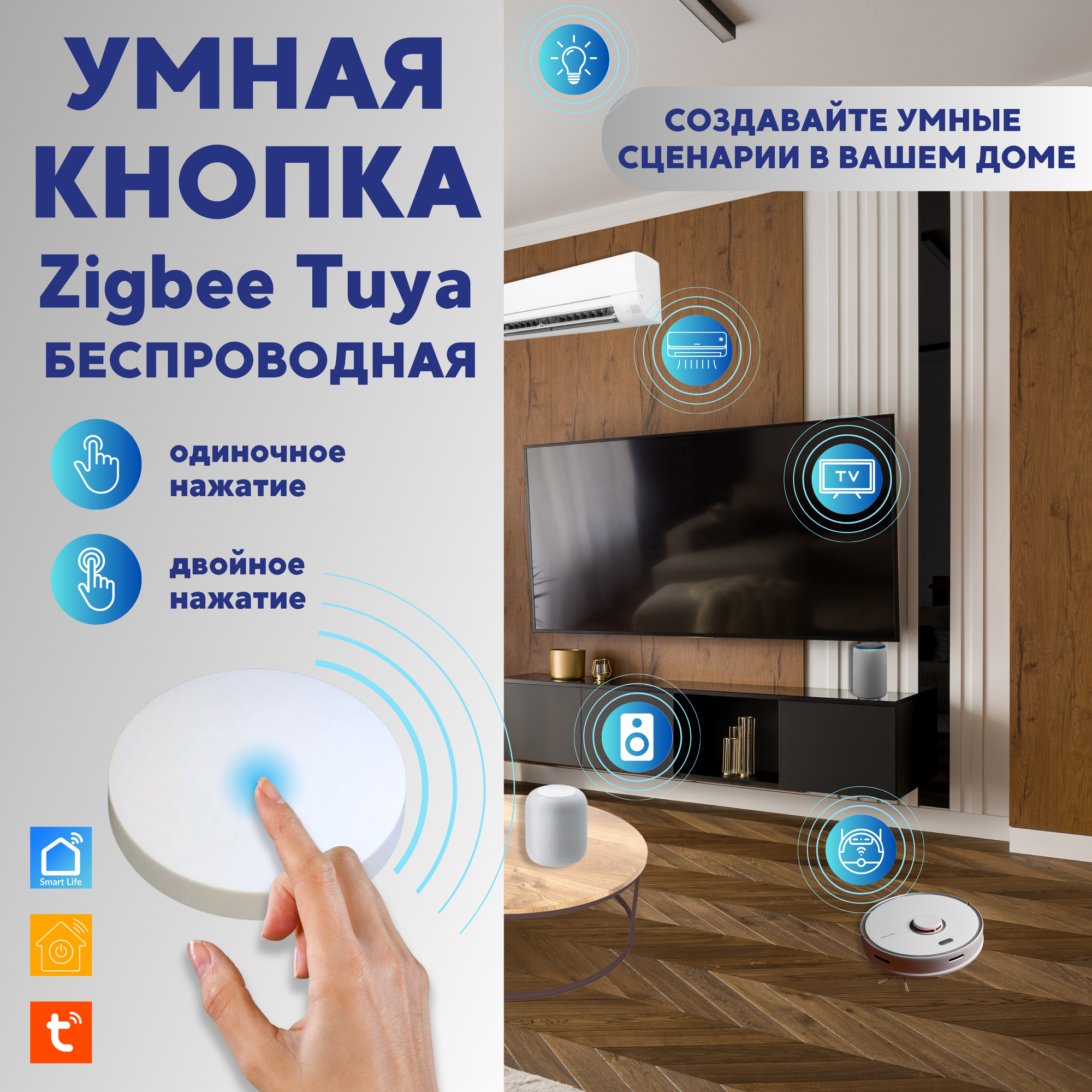 | Дополнительная информация | с помощью умной кнопки Вы можете управлять устройствами работающими как на ZigBee, так и с помощью WiFi |
