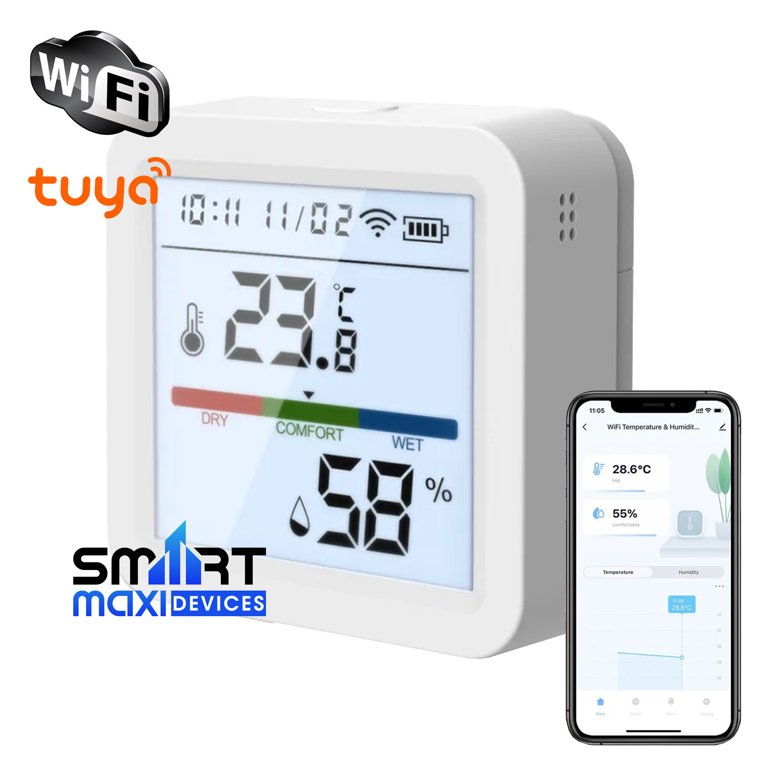 Купить WiFi датчик температуры и влажности для умного дома. Работает с Алисой через связку Digma Smart Life