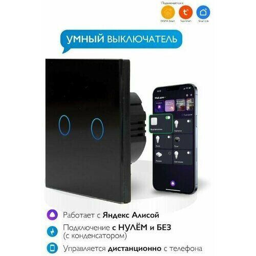 Умный Сенсорный выключатель Wi-Fi с Алисой 2в1 без нуля и С нулем на 1000W на 2 группы света Tuya Чёрный (Комплект 2шт.) интересное: