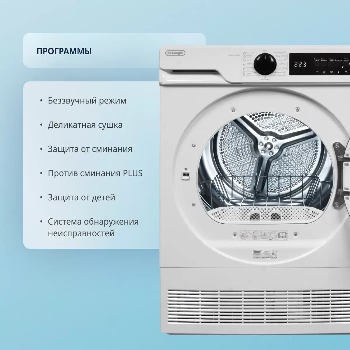 Сушильная машина DeLonghi DTD 8105 C FABIO отдельностоящая, 8 кг, белая, 3 уровня сушки, подсветка барабана интересное:
