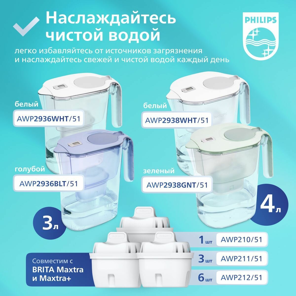 Набор фильтр-кувшинов Philips AWP2936BLT/51, 3 л, синий + Philips AWP2938WHT/51, 4 л, белый интересное: