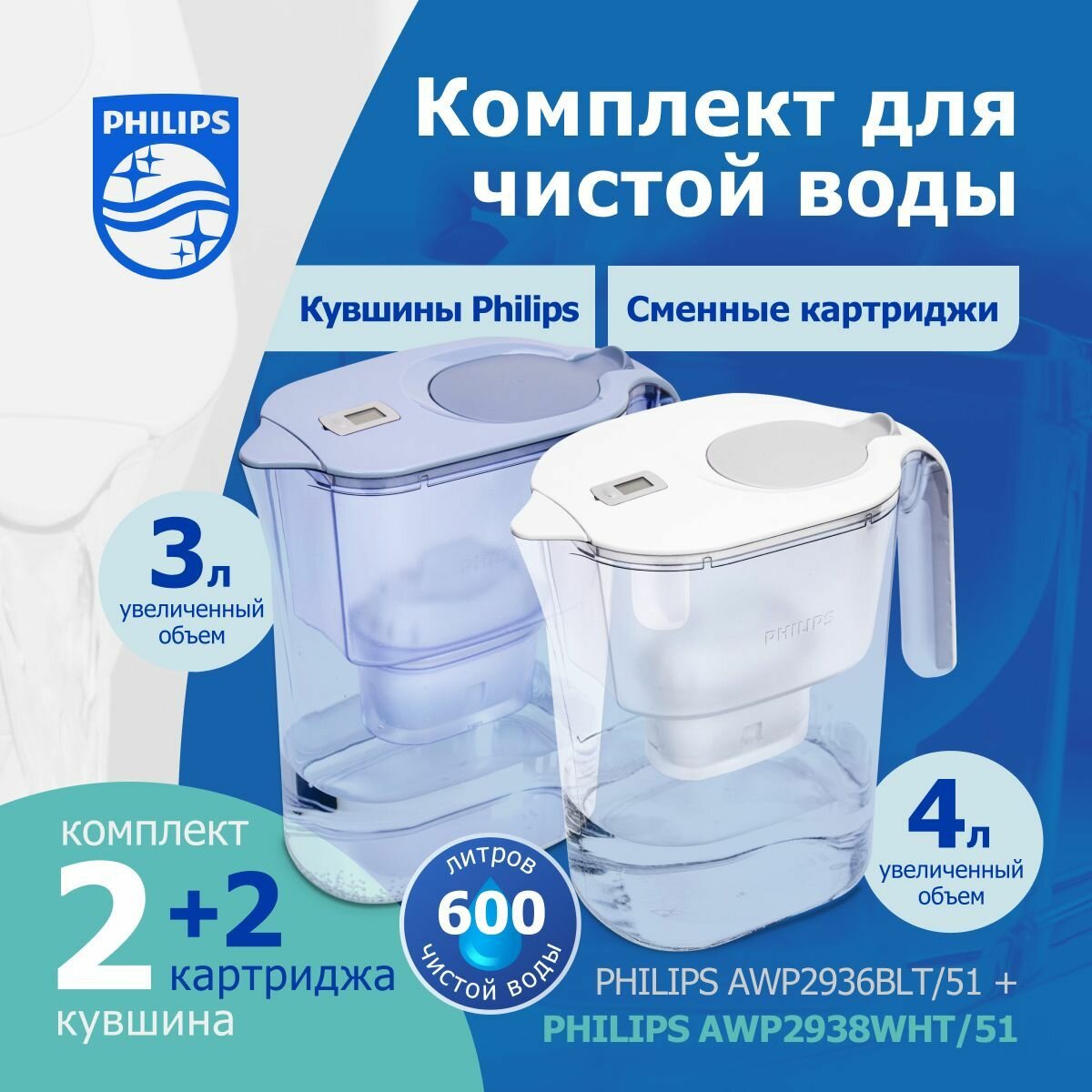 Купить Набор фильтр-кувшинов Philips AWP2936BLT/51, 3 л, синий + Philips AWP2938WHT/51, 4 л, белый