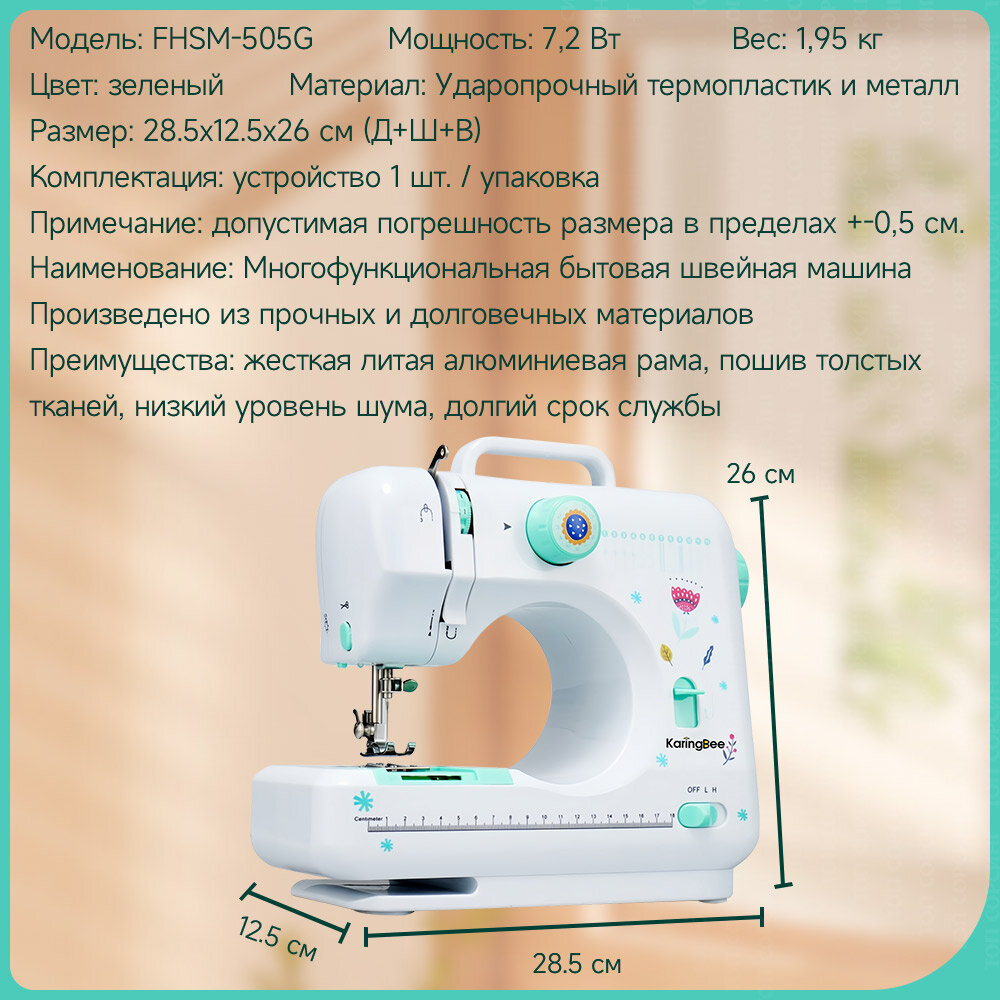 СохранитьШвейная машина KaringBee FHSM-505G зеленый+набор аксессуаров, электрическая от сети, реверс, регулировка скорости, нитевдеватель и подсветка,12 видов строчек интересное: