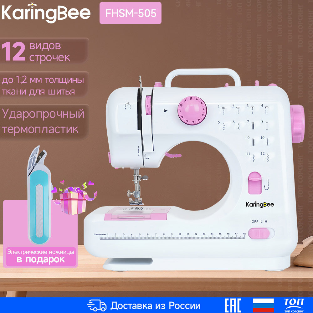 Купить Швейная машина KaringBee FHSM-505, розовая, электрическая от сети и батареек, реверс, регулировка скорости, нитевдеватель и подсветка,12 видов строчек