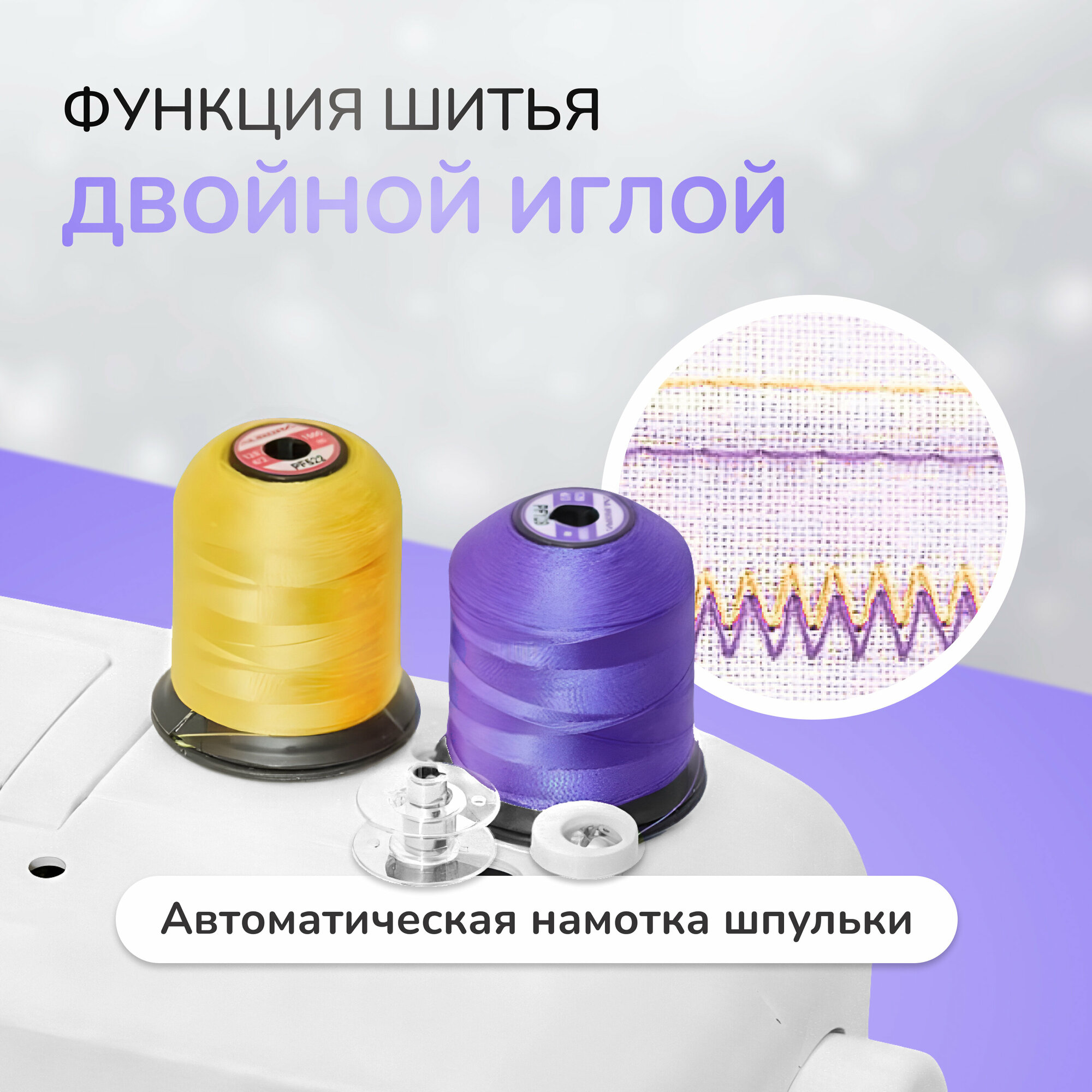 | Особенности | двойная игла, ограничитель скорости, система измерения размера пуговиц, швейный советник |