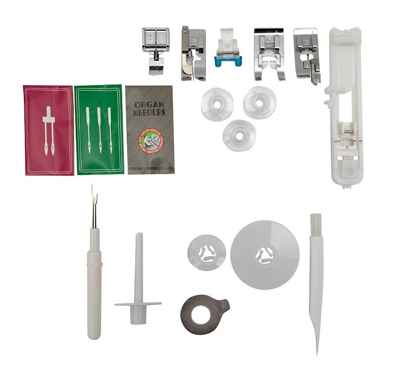 | Подробная комплектация | Сумочка для аксесуаров, Вспарыватель для петель, Инструкция, Краеобметочная лапка "G", Лапка для вшивания молнии "I", Лапка для монограмм N, Лапка для обметывания петель "A", Лапка для потайной строчки "R", Лапка для пришивания пуговиц "M", Лапка для строчки зигзаг "J" (установлена на машине), Мягкий чехол, Набор игл, Отвертка большая, Шнур питания, Шпулька (4шт) (одна установлена на машине), Щеточка для очистки |