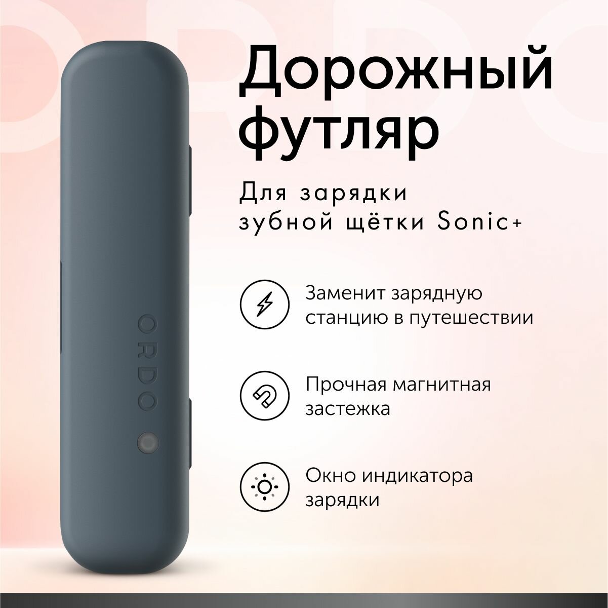 | Дополнительная информация | Дорожный футляр для электрической зубной щетки ORDO Sonic+; Вы можете использовать прилагаемый USB-кабель для подключения дорожного футляра к USB-адаптеру, компьютеру или блоку питания; В дорожном футляре есть окошко, через которое можно увидеть индикатор состояния зарядки вашей зубной щетки; |