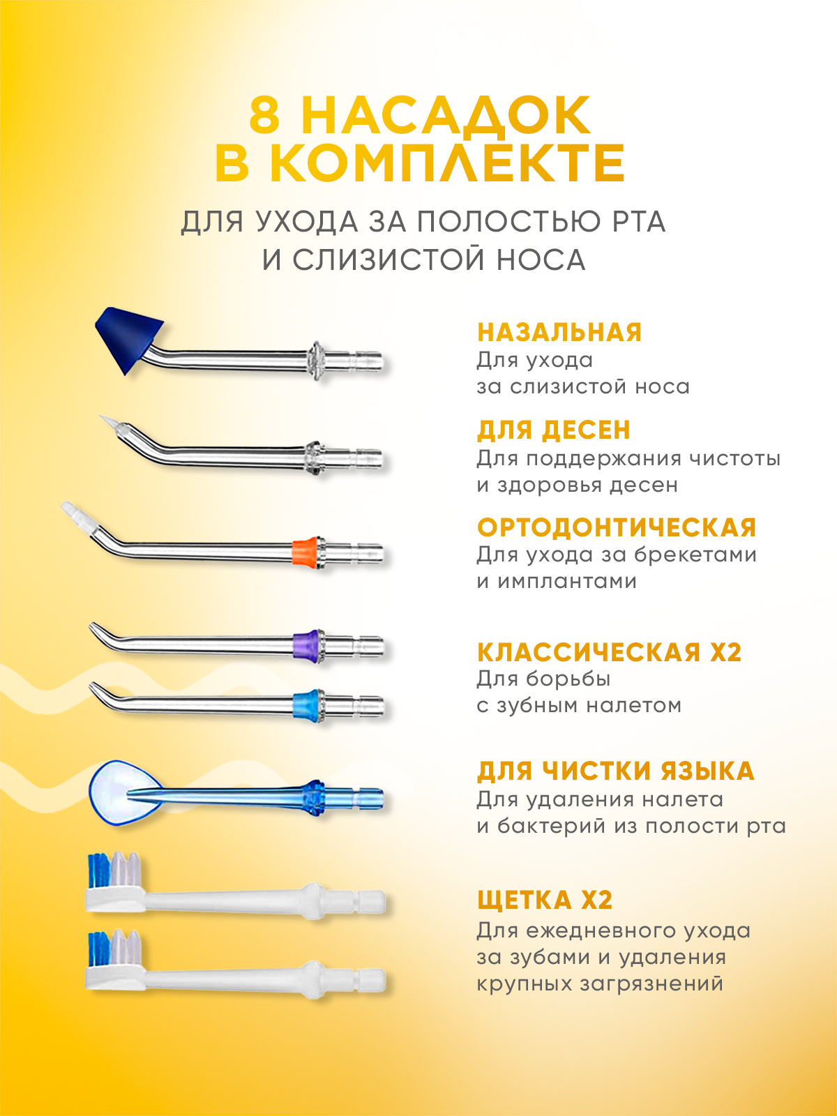 | Насадки | для струйной чистки / для чистки языка / назальная / насадка-щетка / ортодонтическая (для брекетов) / пародонтологическая (для десен) |