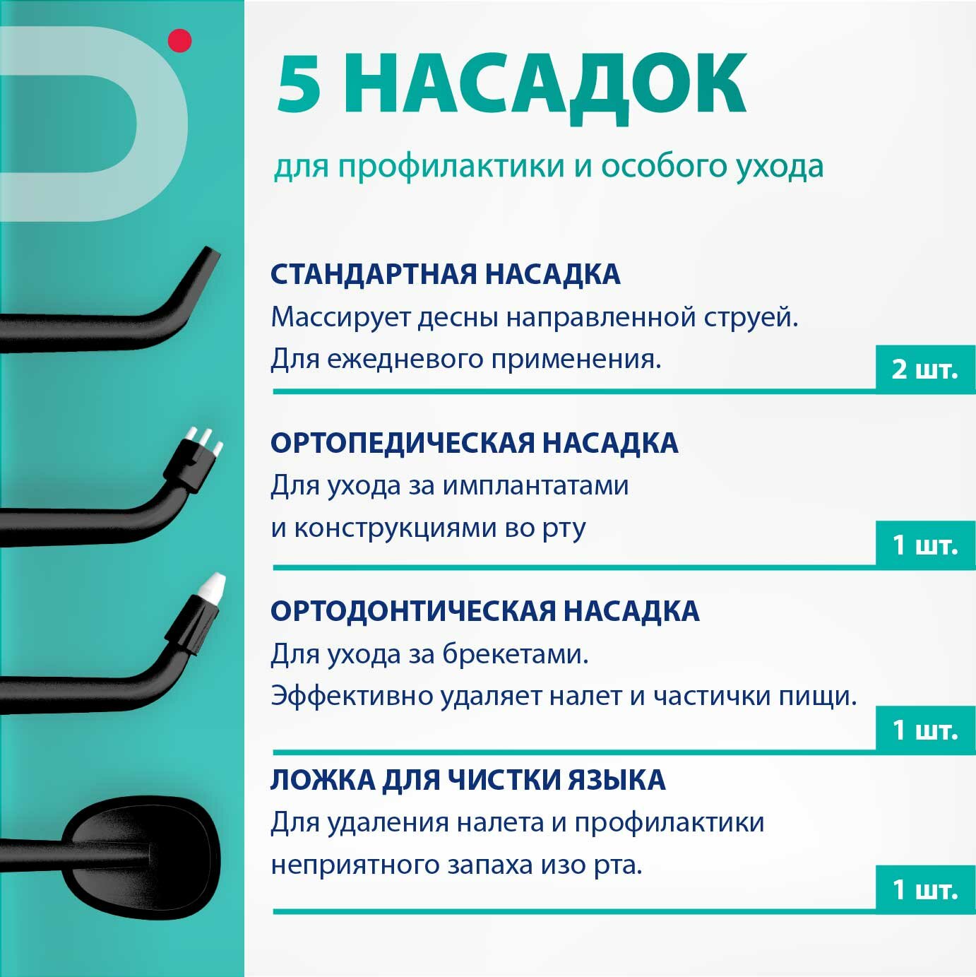 | Подробная комплектация | Стандартная насадка для очистки межзубных промежутков – 2 шт.; Насадка-ложка для чистки языка – 1 шт.; Ортодонтическая насадка для брекетов – 1 шт.; Пародонтологическая насадка - 1 шт., USB-зарядная станция - 1 шт; |