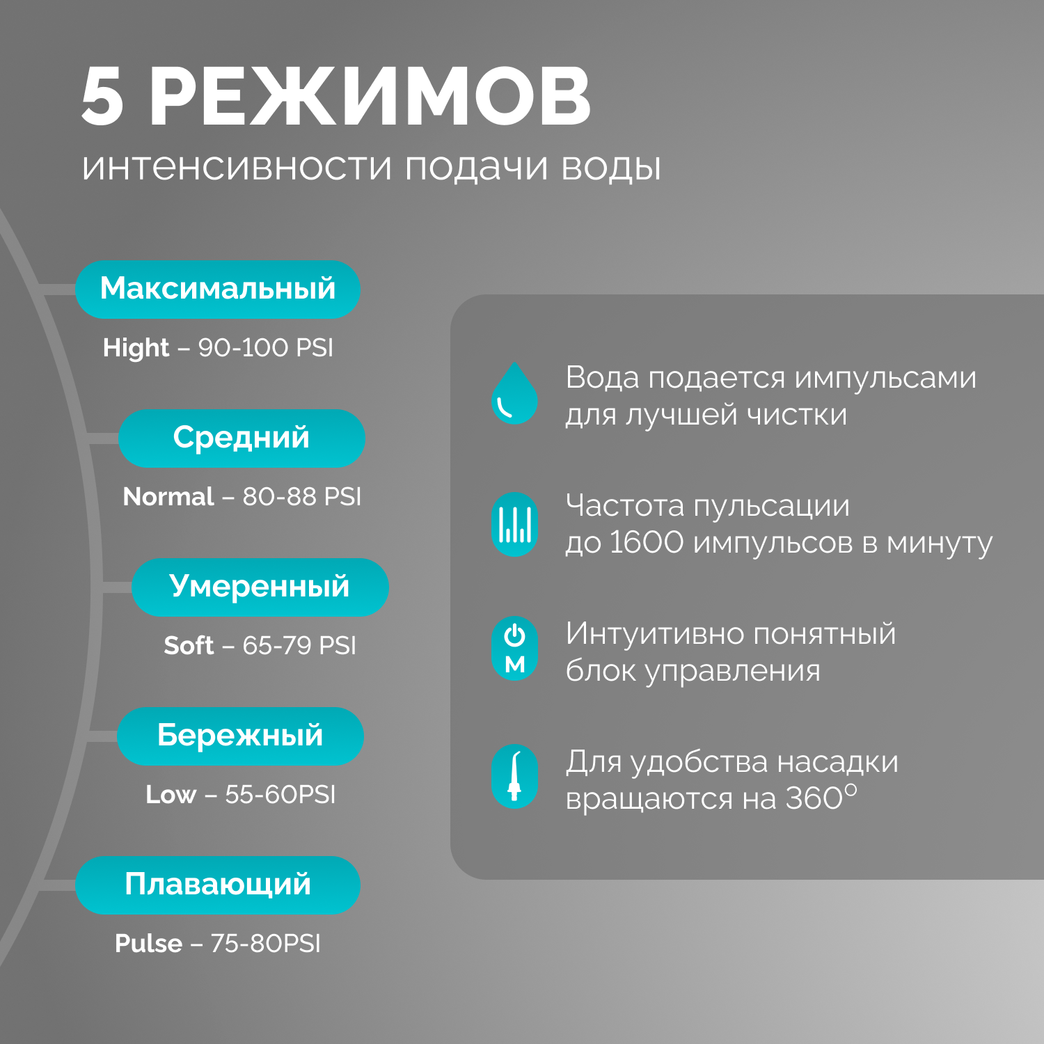 | Число режимов/регулировок ирригатора | 5 |