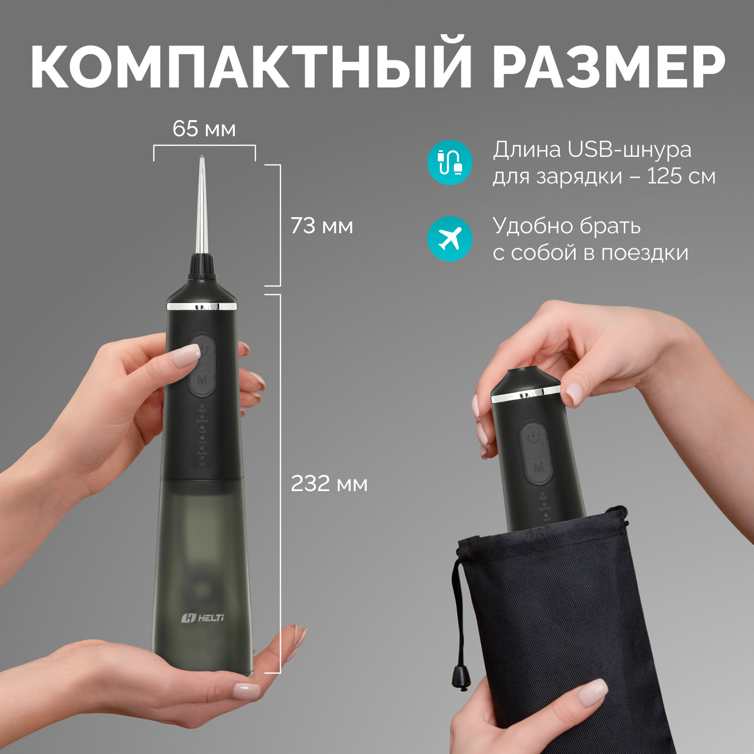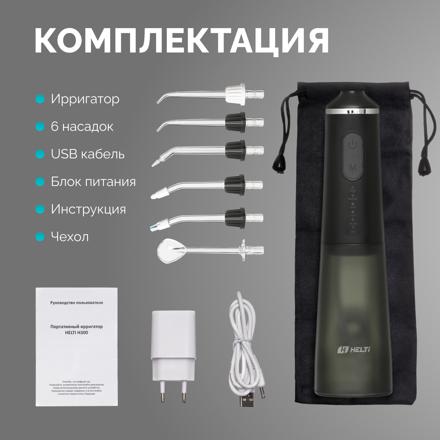 Ирригатор для полости рта портативный HELTI черный, 6 насадок, 5 режимов, емкость 300 мл, для двоих с зарядным устройством, беспроводной, компактный, чехол для хранения в подарок
