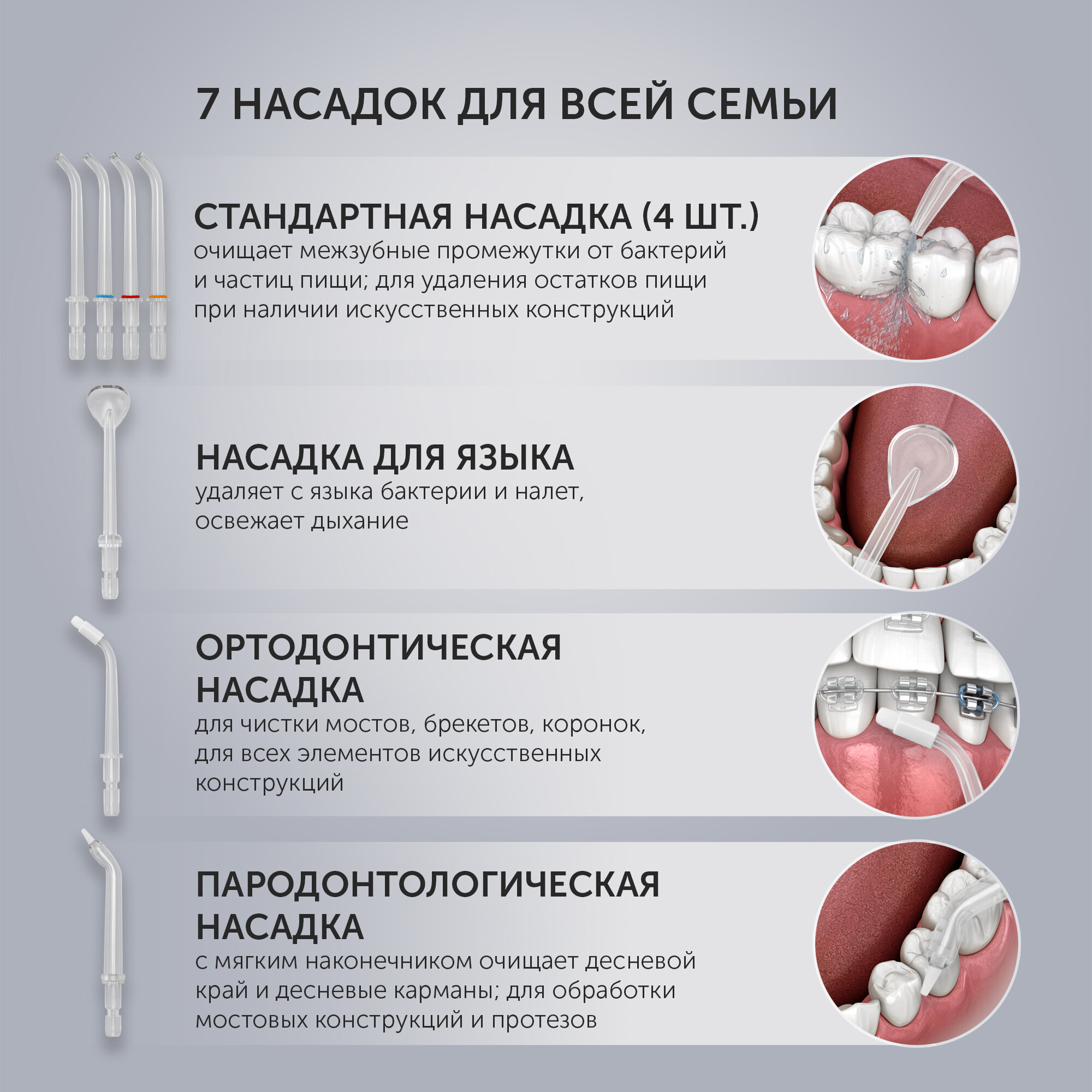 | Насадки | для чистки имплантов и коронок / для чистки языка / ортодонтическая (для брекетов) / пародонтологическая (для десен) |