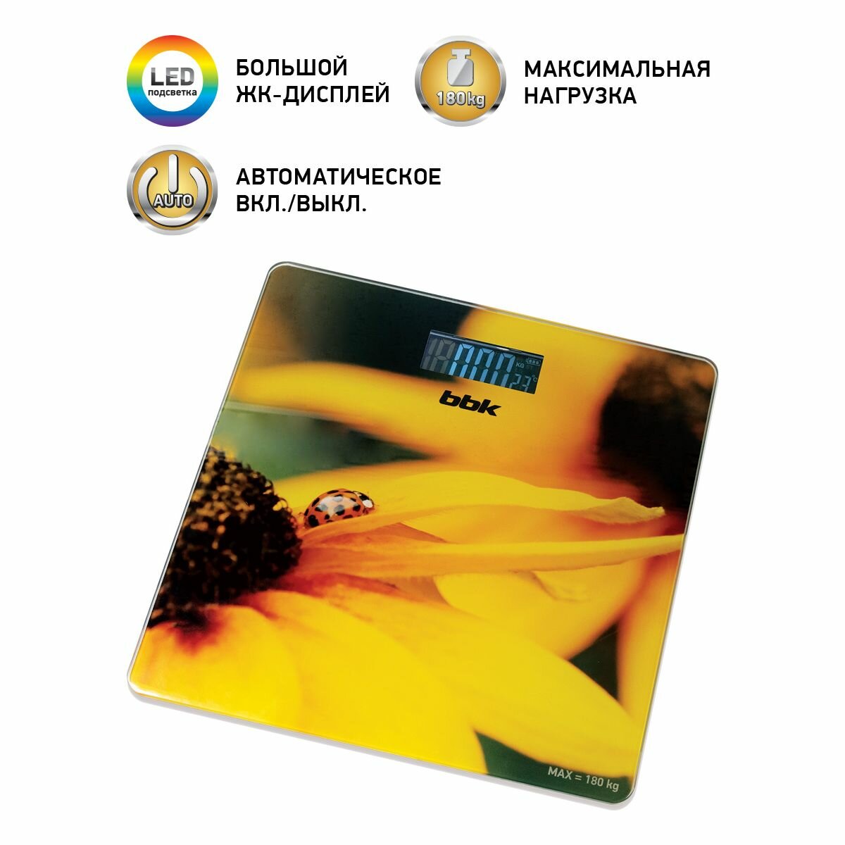 Весы напольные BBK BCS3005GE желтый, LCD-дисплей, максимальный вес 180 кг, точность измерения 100 г, автоматическое отключение