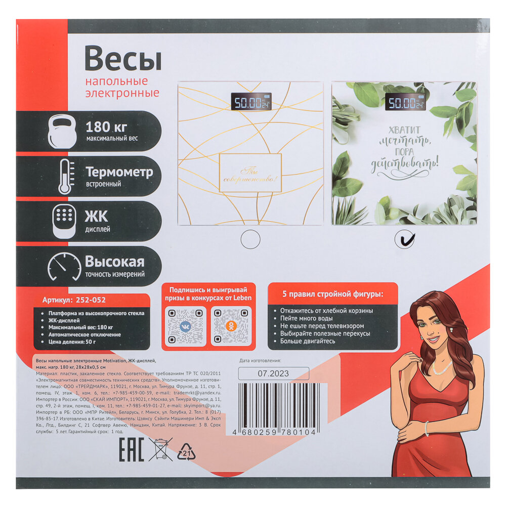 Весы напольные электронные Motivation, ЖК-дисплей, макс. нагр. до 180кг, 28х28х0,5см интересное: