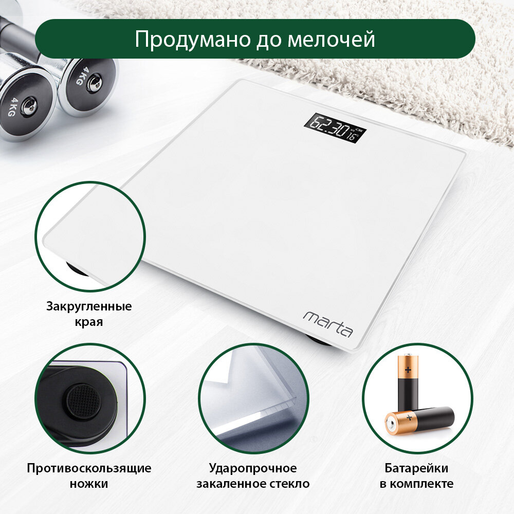 MARTA MT-1684 белый жемчуг LCD весы напольные диагностические, умные с Bluetooth интересное: