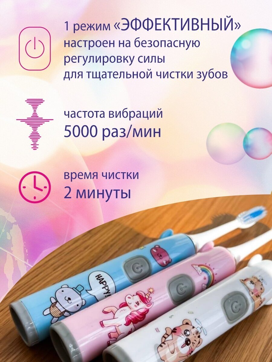 Электрическая зубная щетка детская, Розовая ультразвуковая электрощетка для детей от 3х лет на батарейке АА с доп. насадками