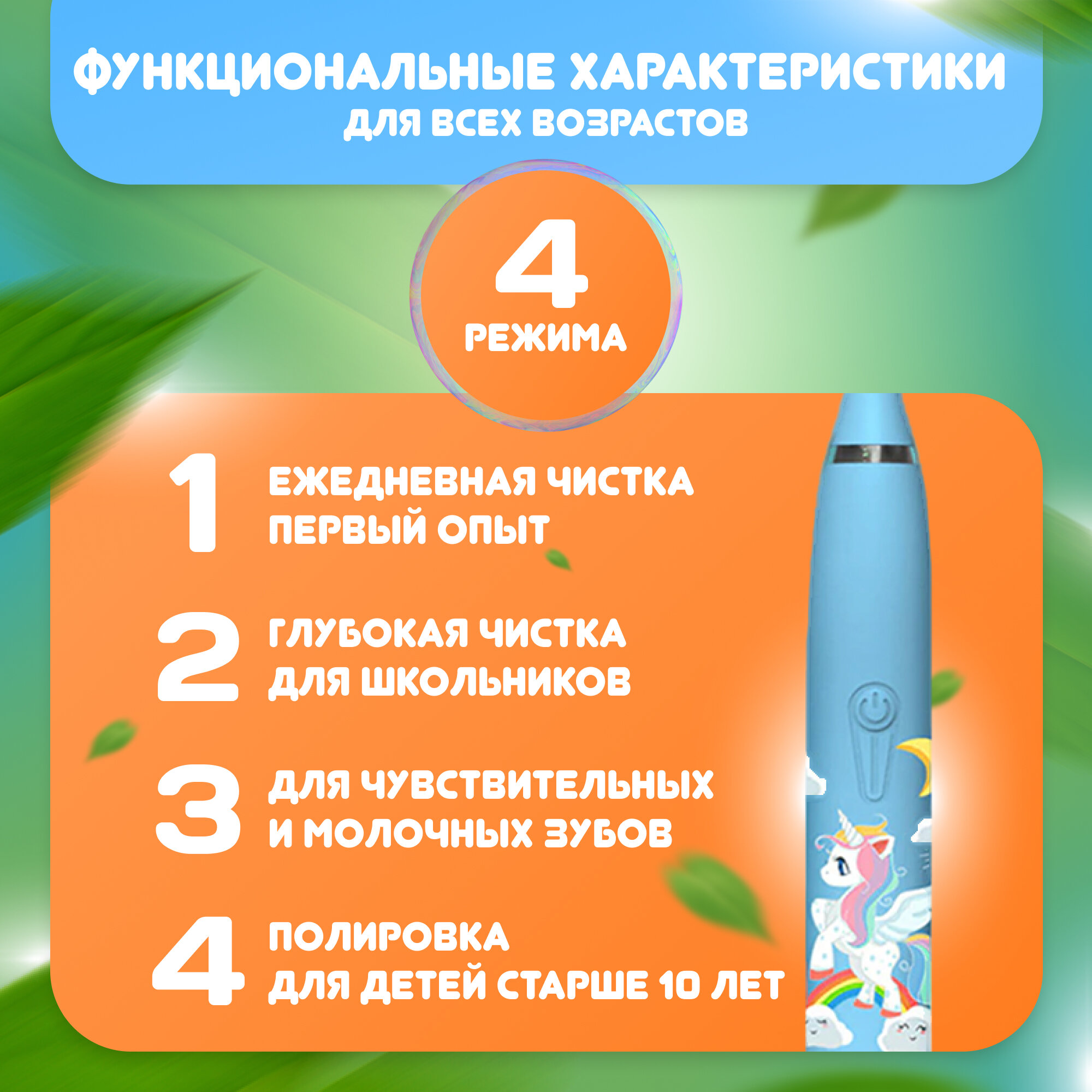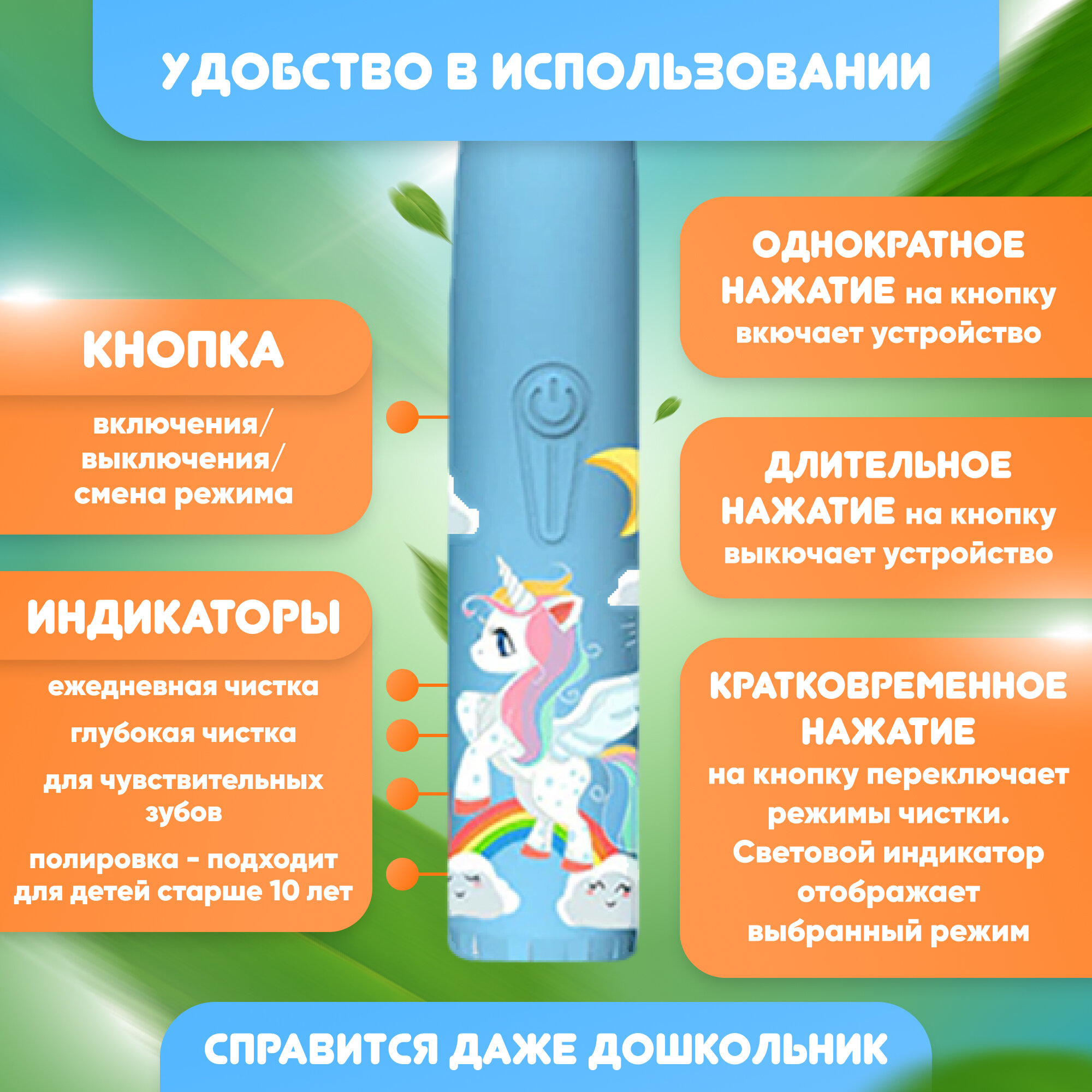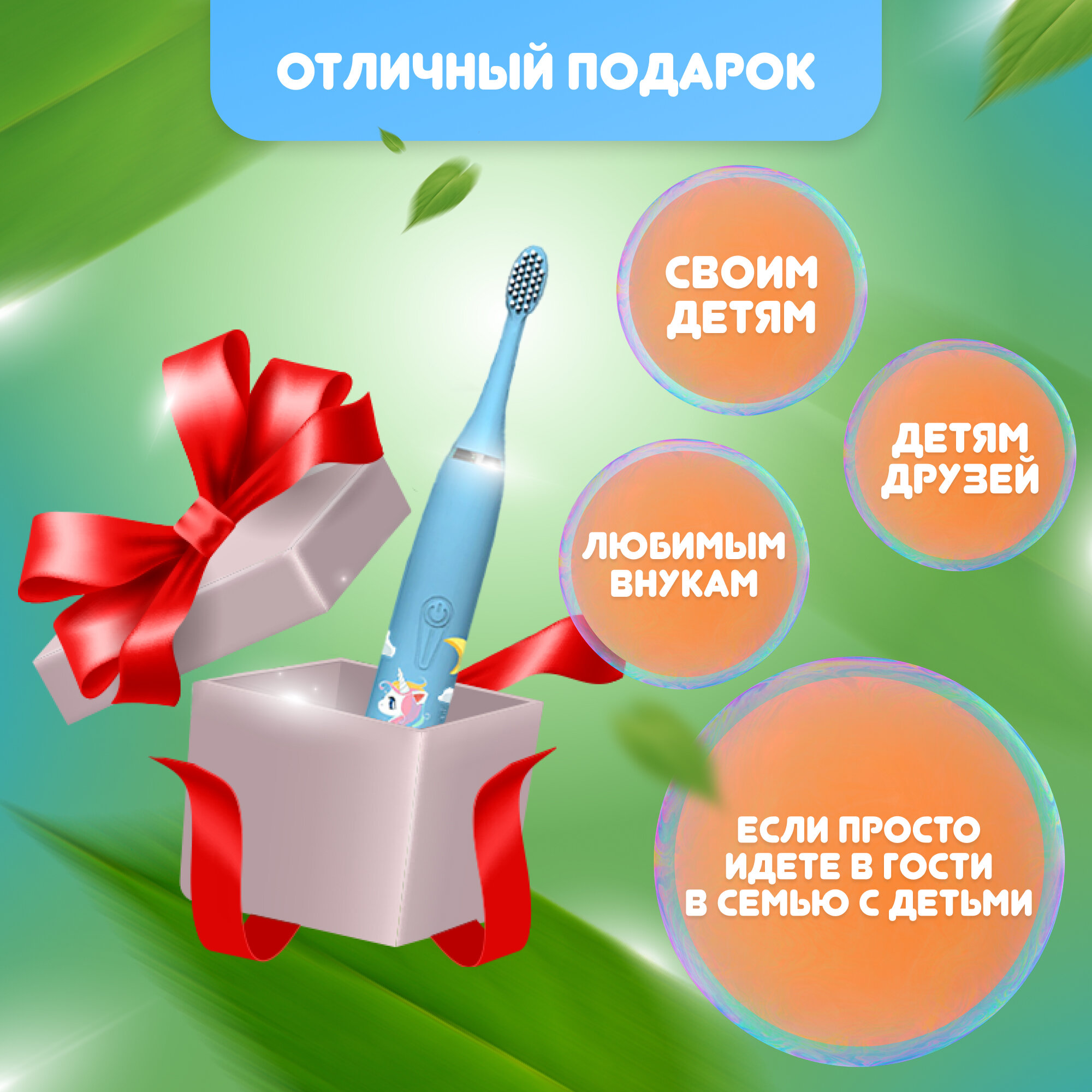 Купить Электрическая звуковая зубная щетка для детей от 3 до 12 лет с автоотключением и таймером 20 секунд / индикация заряда / 4 насадки / голубая