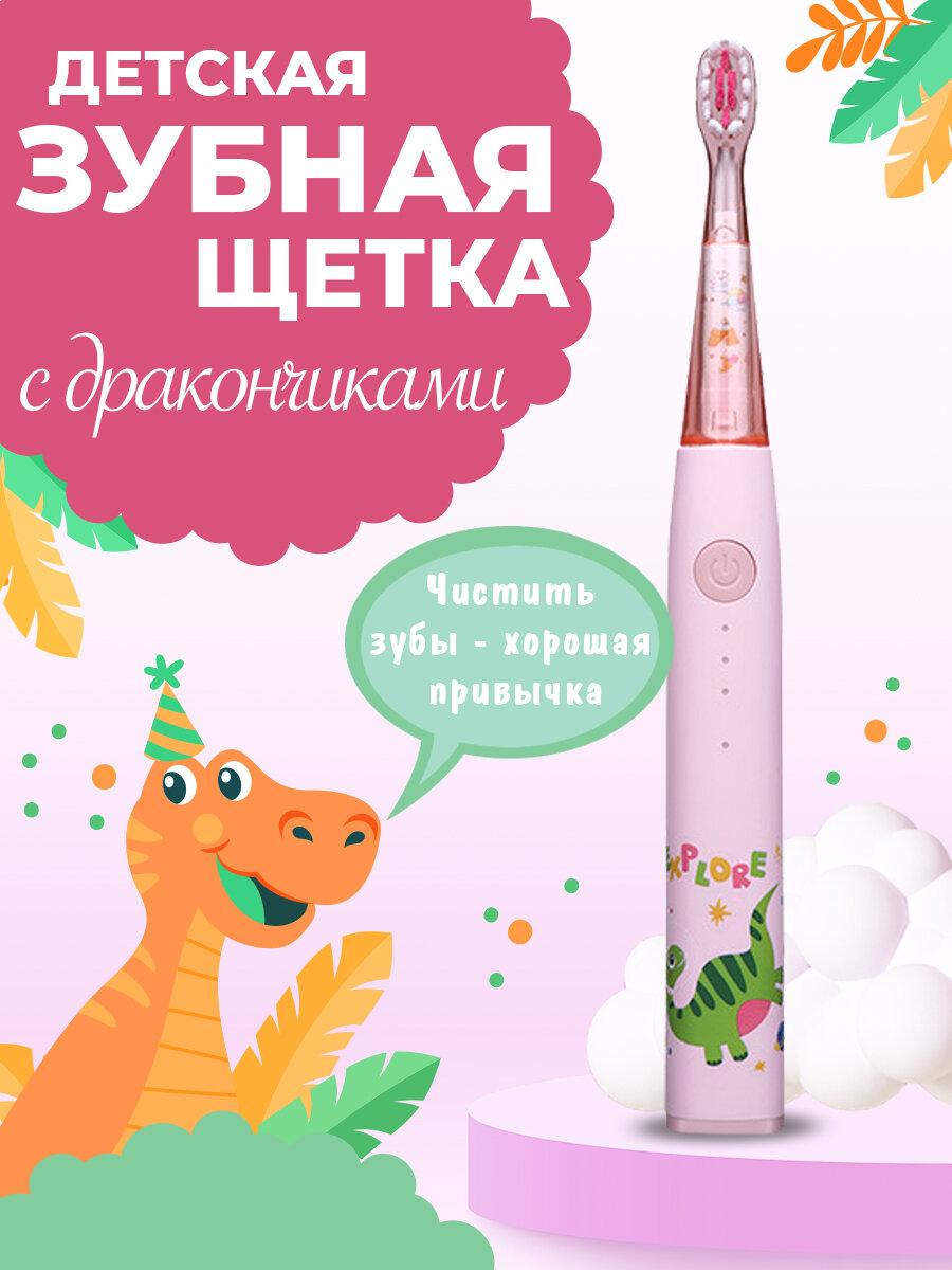 Купить Электрическая зубная щетка детская звуковая с таймером чистки для детей, 2 насадки, розовый