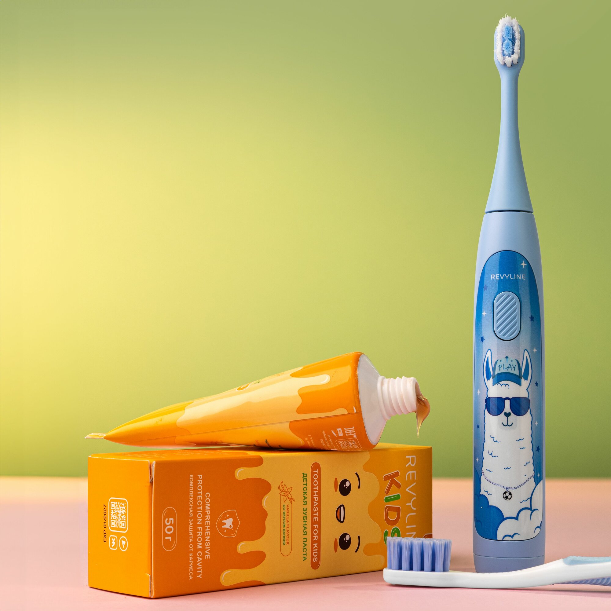 Электрическая зубная щетка Revyline RL 035 голубая + Зубная паста Revyline Kids, 50 г.