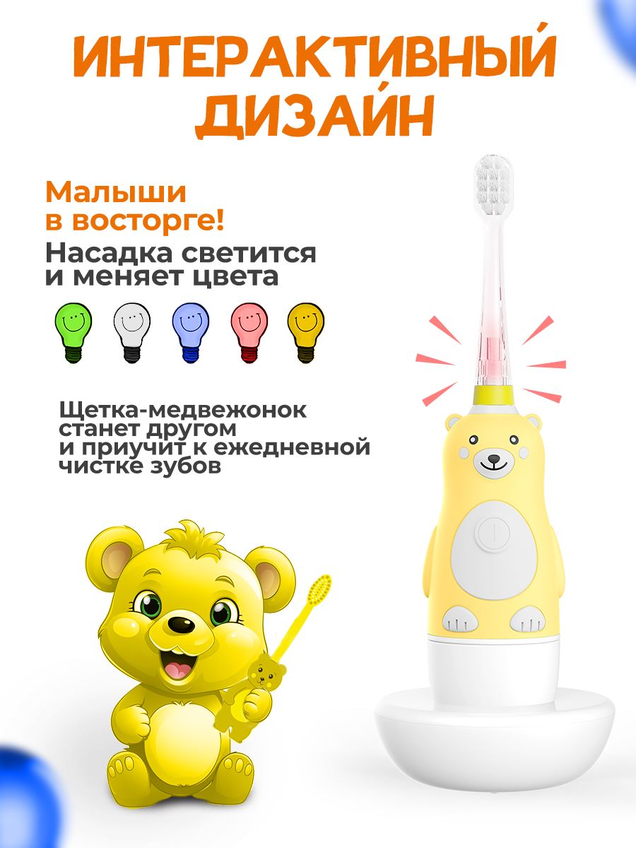 Электрическая зубная щетка для детей BANNER Happy Bear на аккумуляторе. Зарядная док-станция + 2 насадки в комплекте