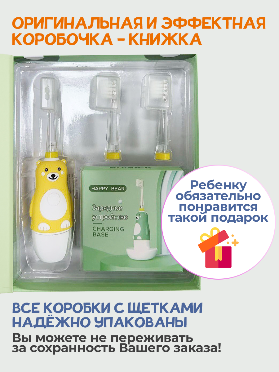 Купить Электрическая звуковая зубная щетка детская BANNER Happy Bear с аккумулятором. Зарядная док-станция + 2 насадки в комплекте