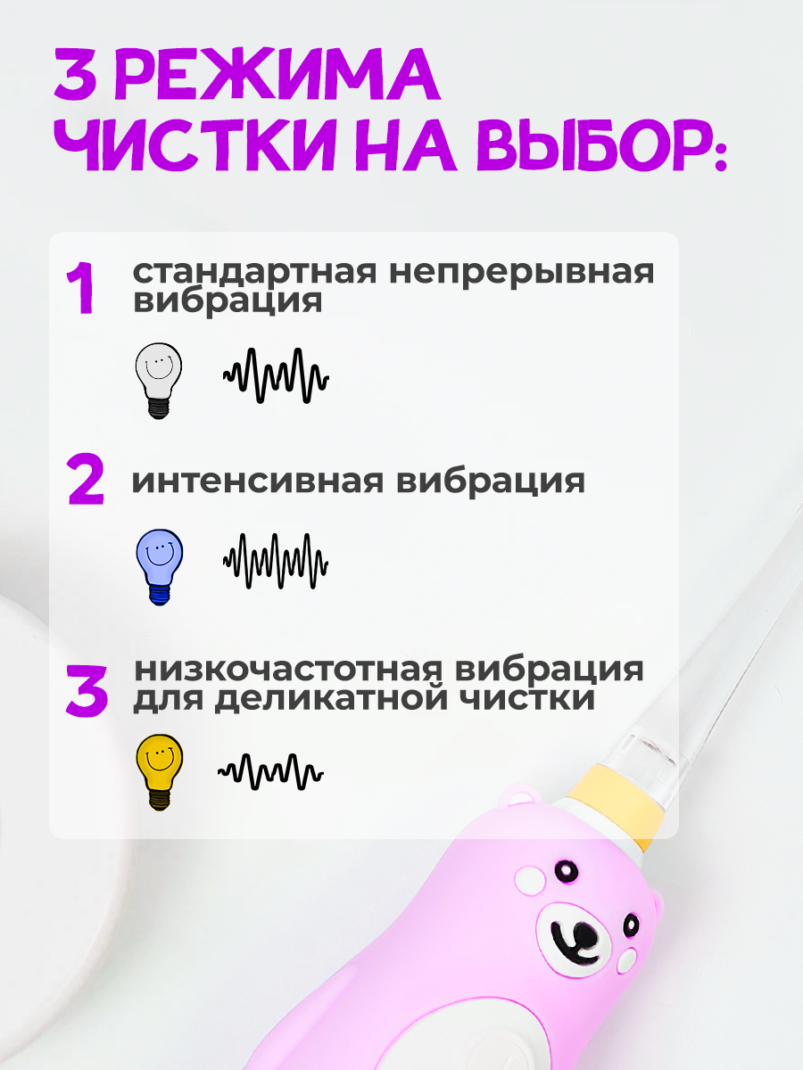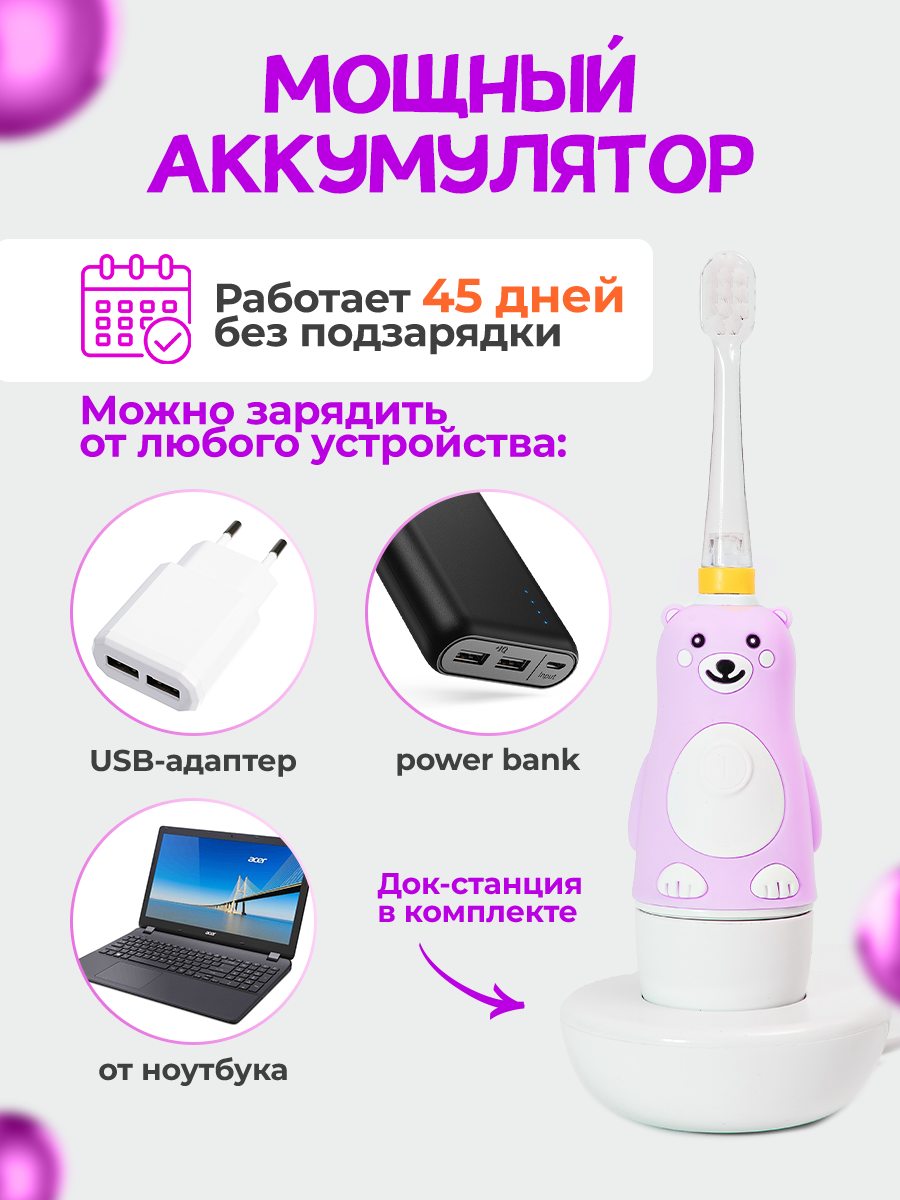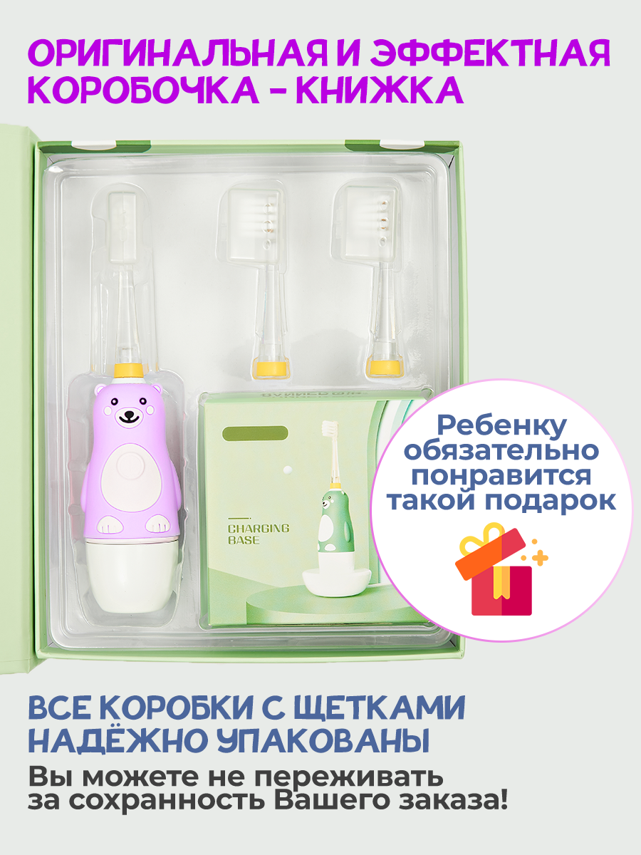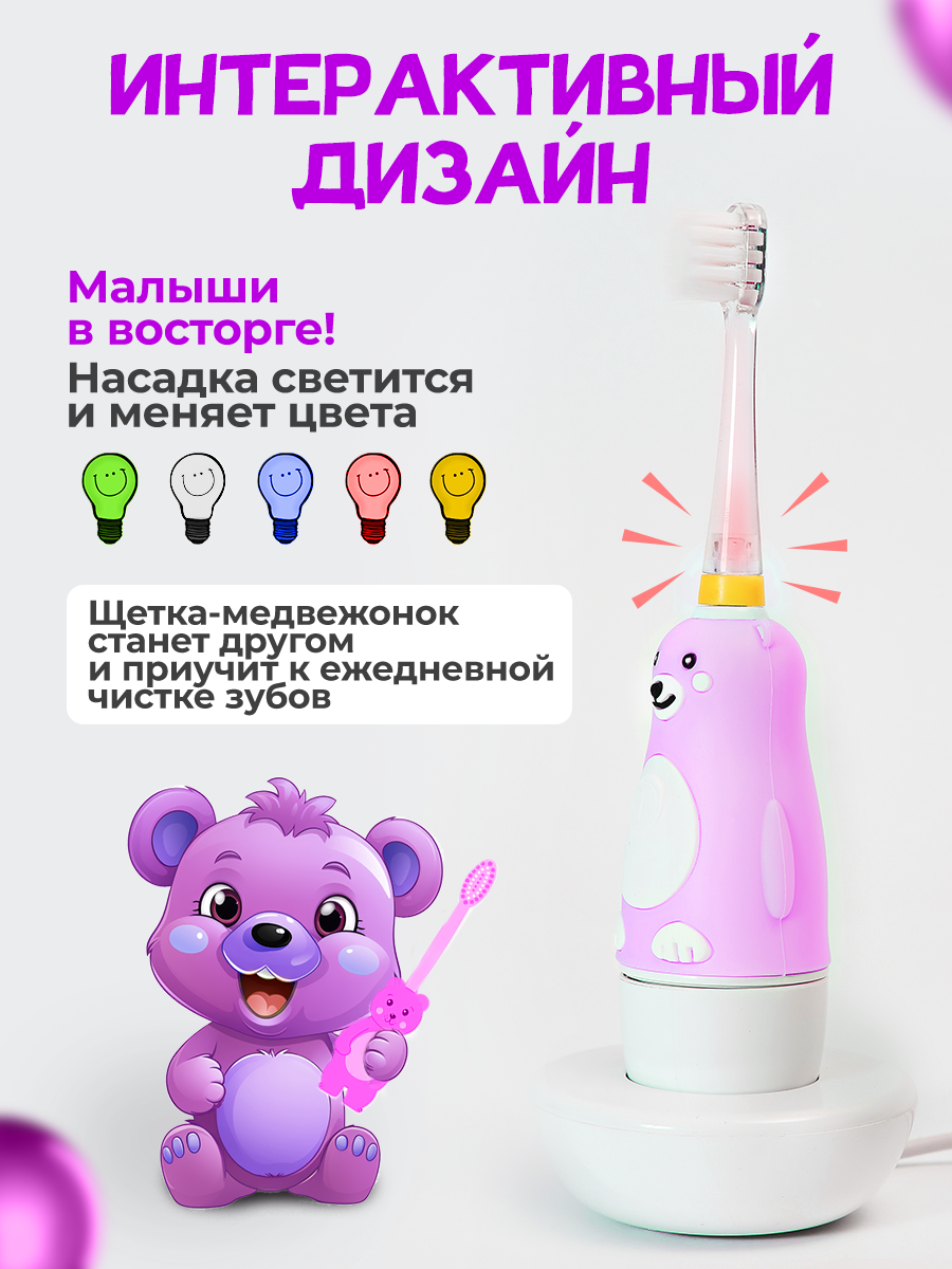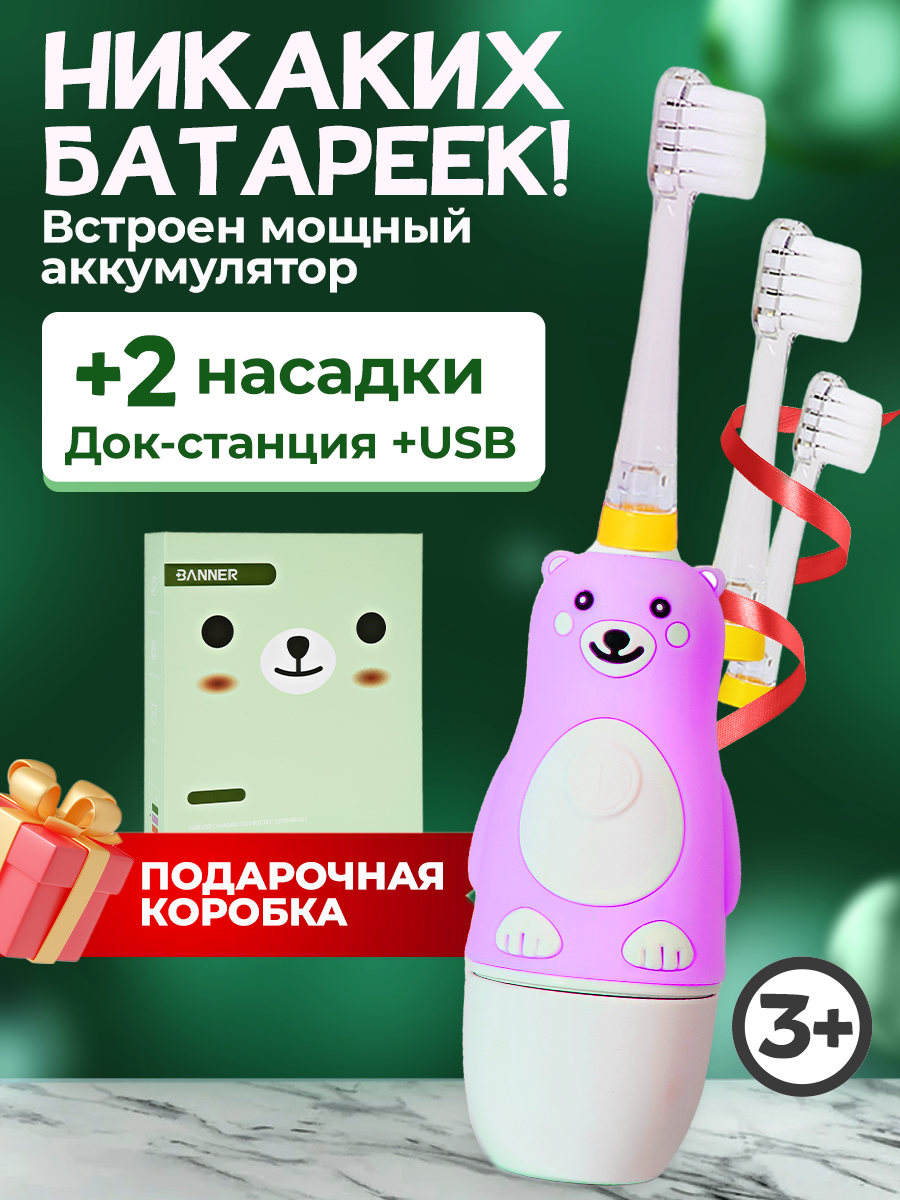 Электрическая звуковая зубная щетка для детей BANNER Happy Bear с аккумулятором. Зарядная док-станция + 2 насадки в комплекте