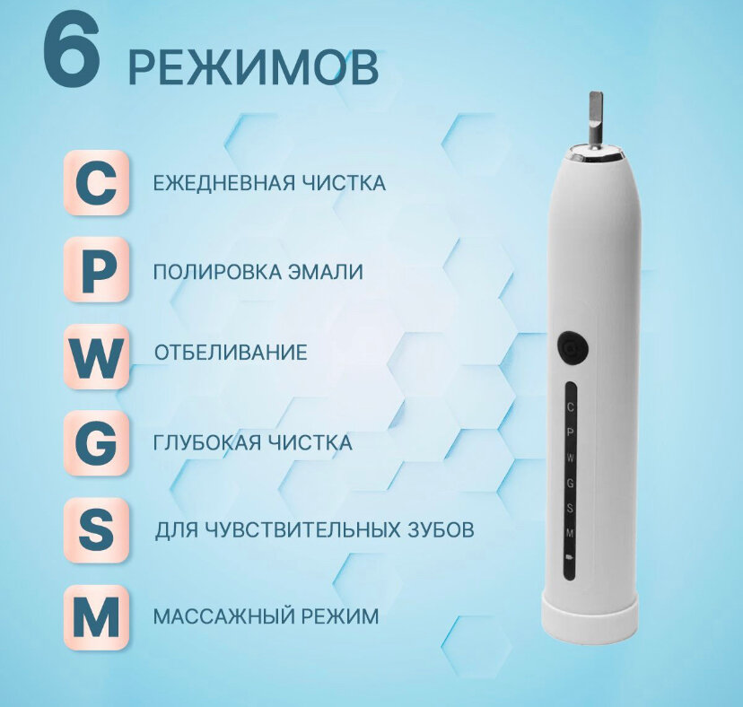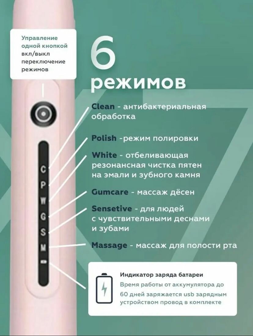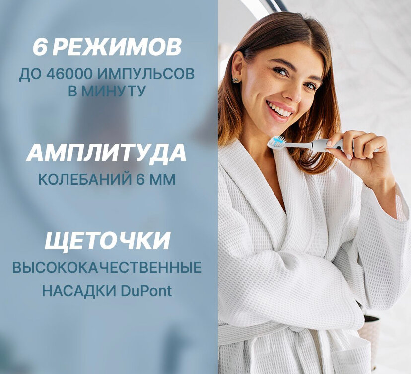 | Режимы работы | деликатная чистка / ежедневная чистка / массаж / отбеливание / полировка / уход за деснами |