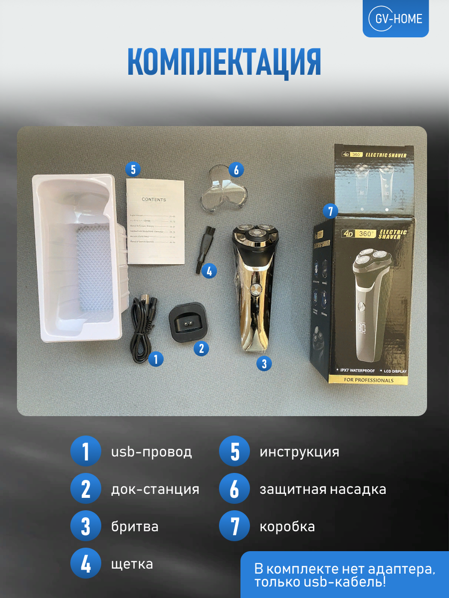 | Подробная комплектация | Электробритва; Док-станция; USB провод; Щеточка для очистки |