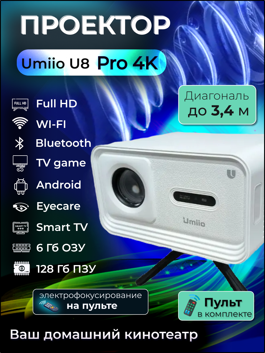 Мини проектор Umiio U8 Pro , 4K, белый