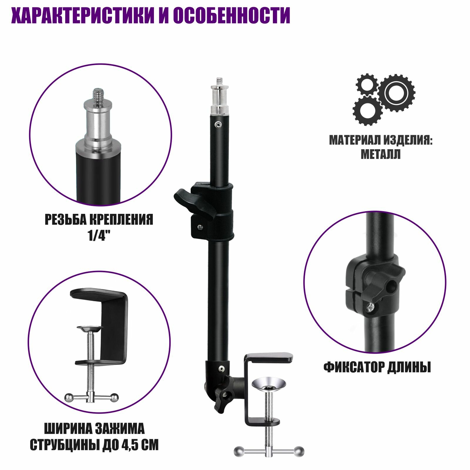 | Подробная комплектация | - Телескопическая штанга с внешней резьбой 1/4" - 1 шт. - Струбцина, зажим до 4,5 см - 1 шт. - Болт шестигранный М6 10 мм оцинкованный - 1 шт. - Шаровое крепление прищепка до 10 см - 1 шт. - Гибкий держатель зажима с внутренней резьбой, длина 10 см - 1 шт. |