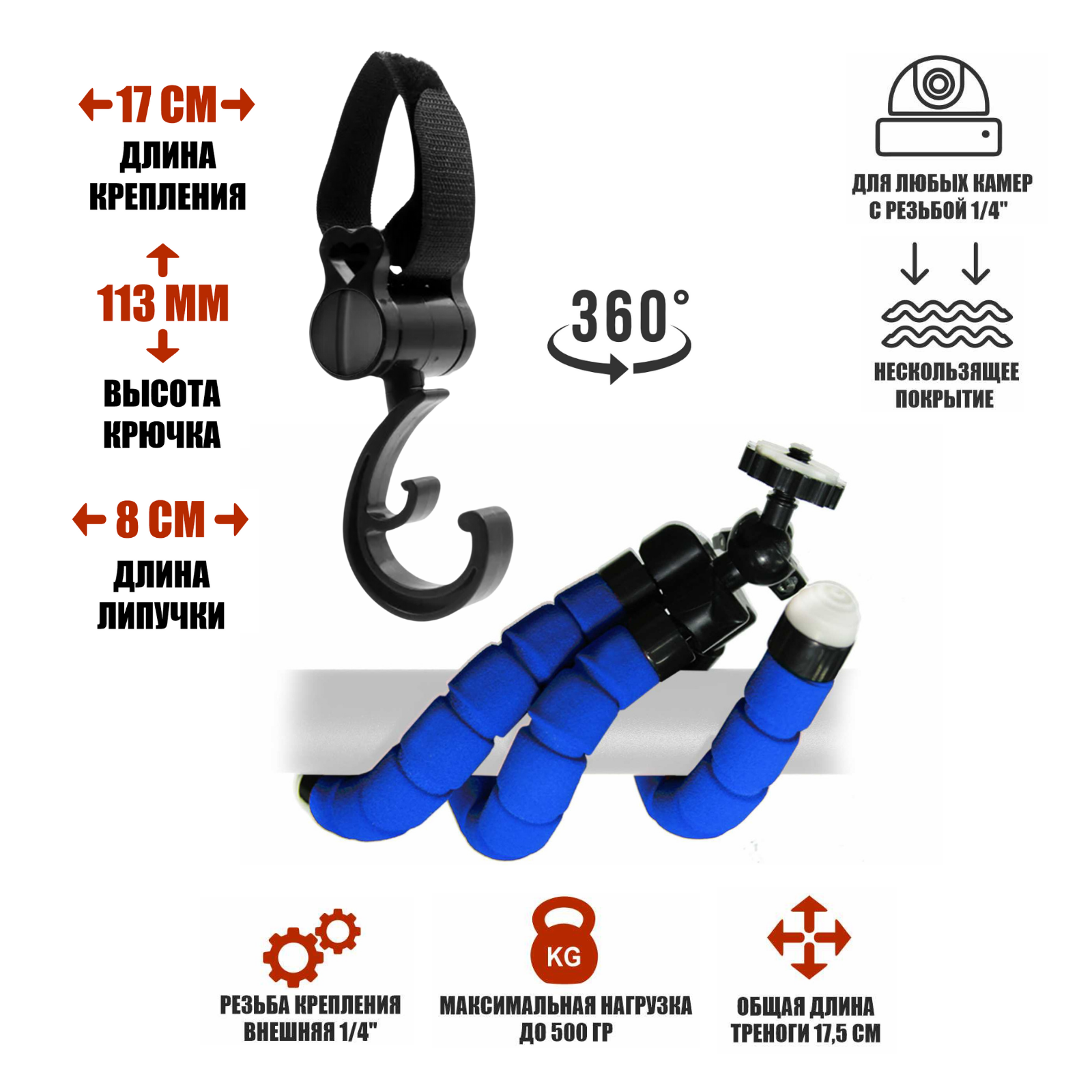 | Подробная комплектация | - Крючок на коляску для сумки - 1 шт; - Держатель FLEX-01B-N на гибких ножках, синий - 1 шт. |