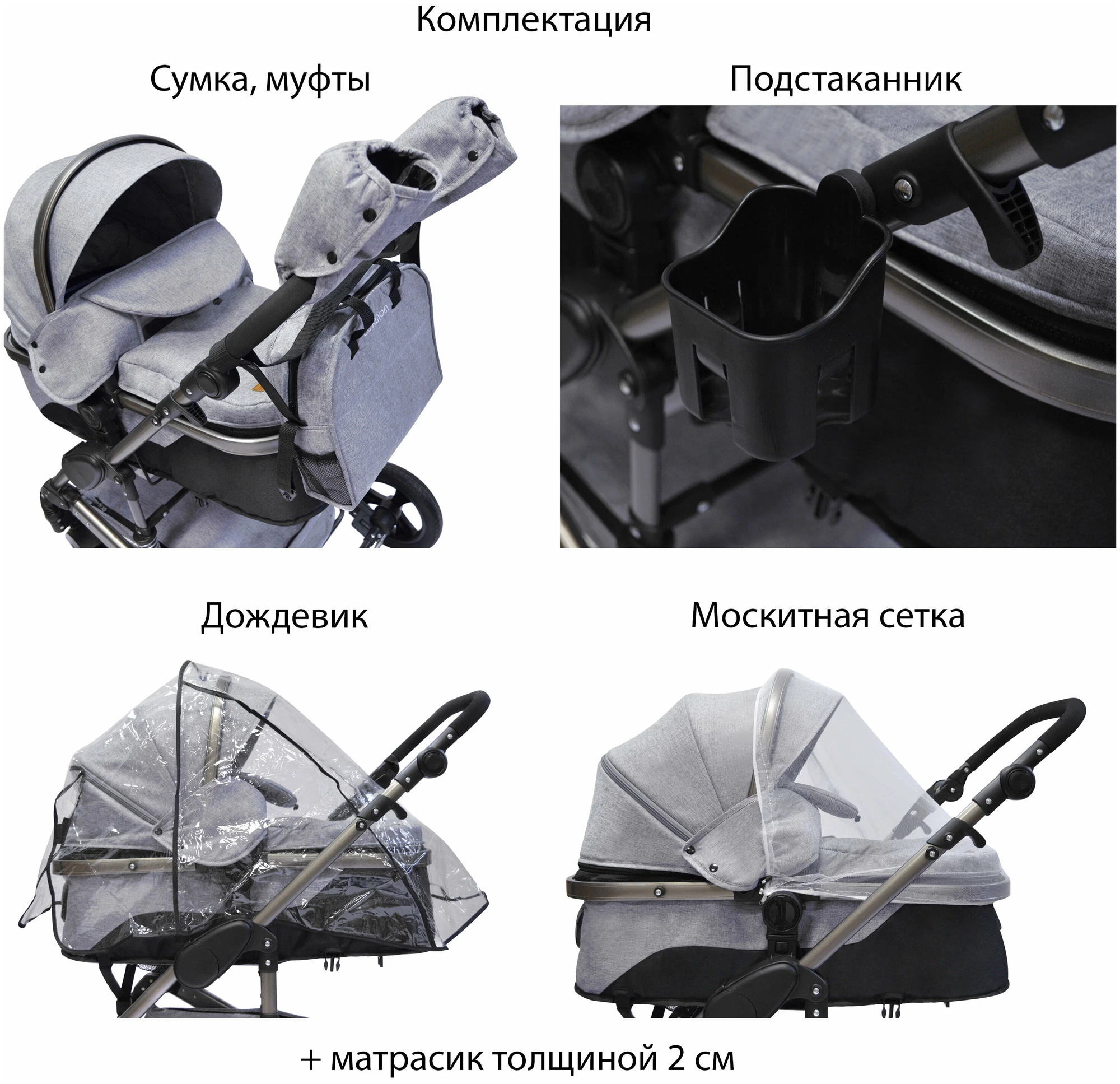 | Аксессуары в комплекте | антимоскитная сетка, бампер, дождевик, матрас, муфта для рук, накидка на ноги, подстаканник, солнцезащитный козырек, сумка, теплый конверт |