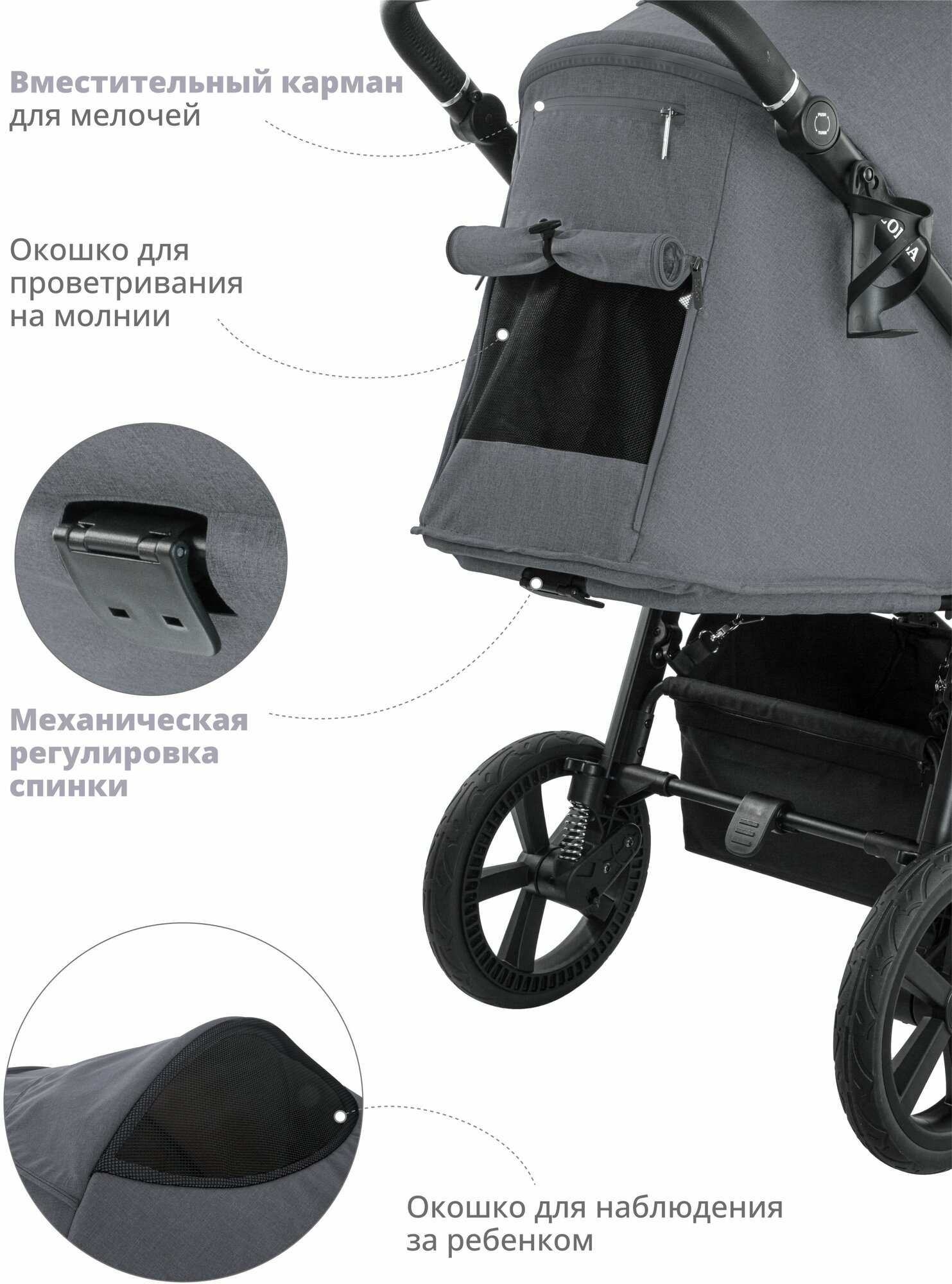 | Капюшон | вентиляция, капюшон опускается до бампера, карман на капюшоне, материал с УФ-защитой, смотровое окно |