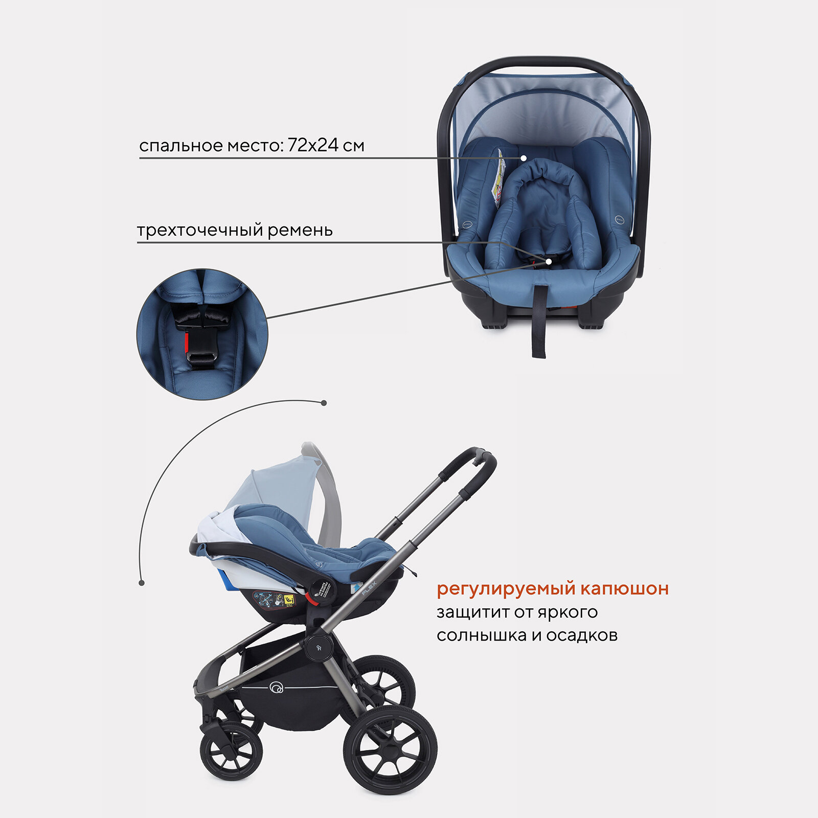 | Капюшон | капюшон опускается до бампера, материал с УФ-защитой, смотровое окно |