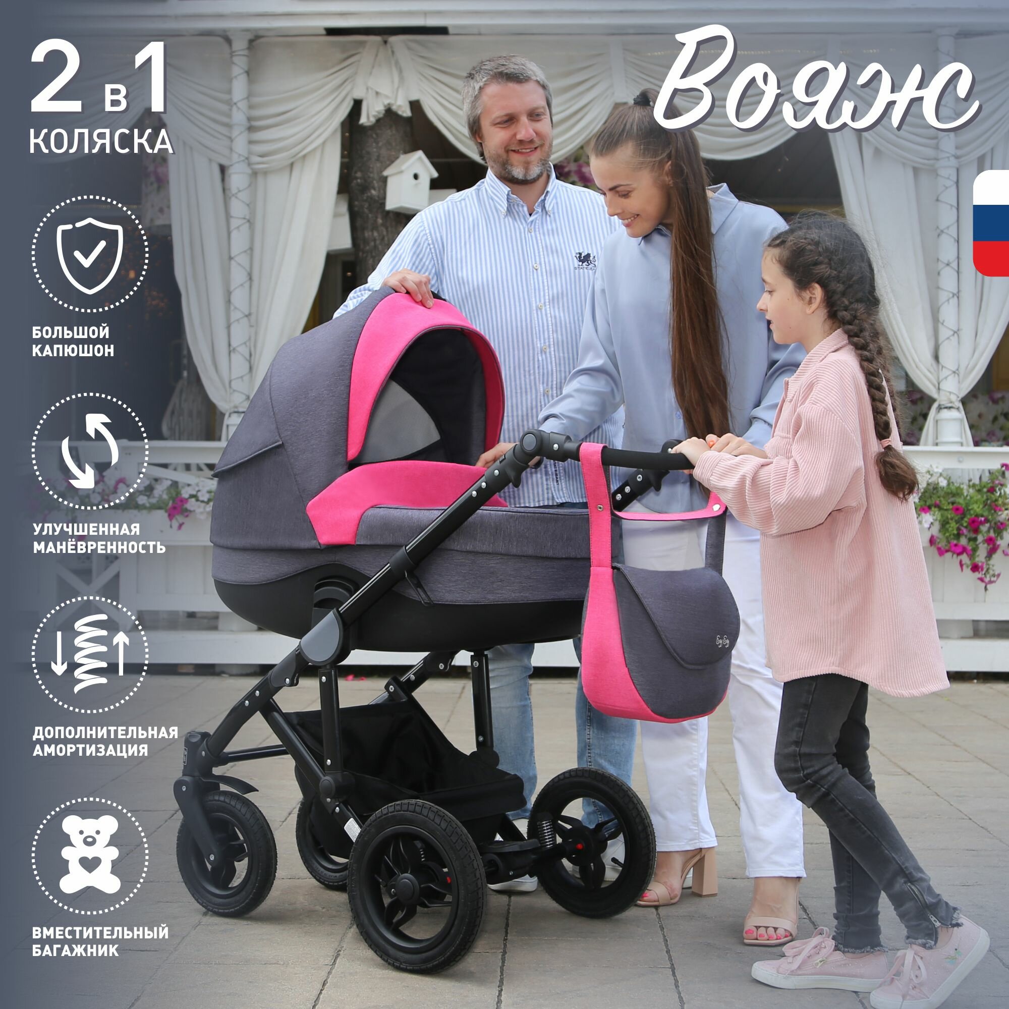 Детская коляска 2 в 1, трансформер, Еду-Еду Вояж, цвет темно-серый/фуксия интересное: