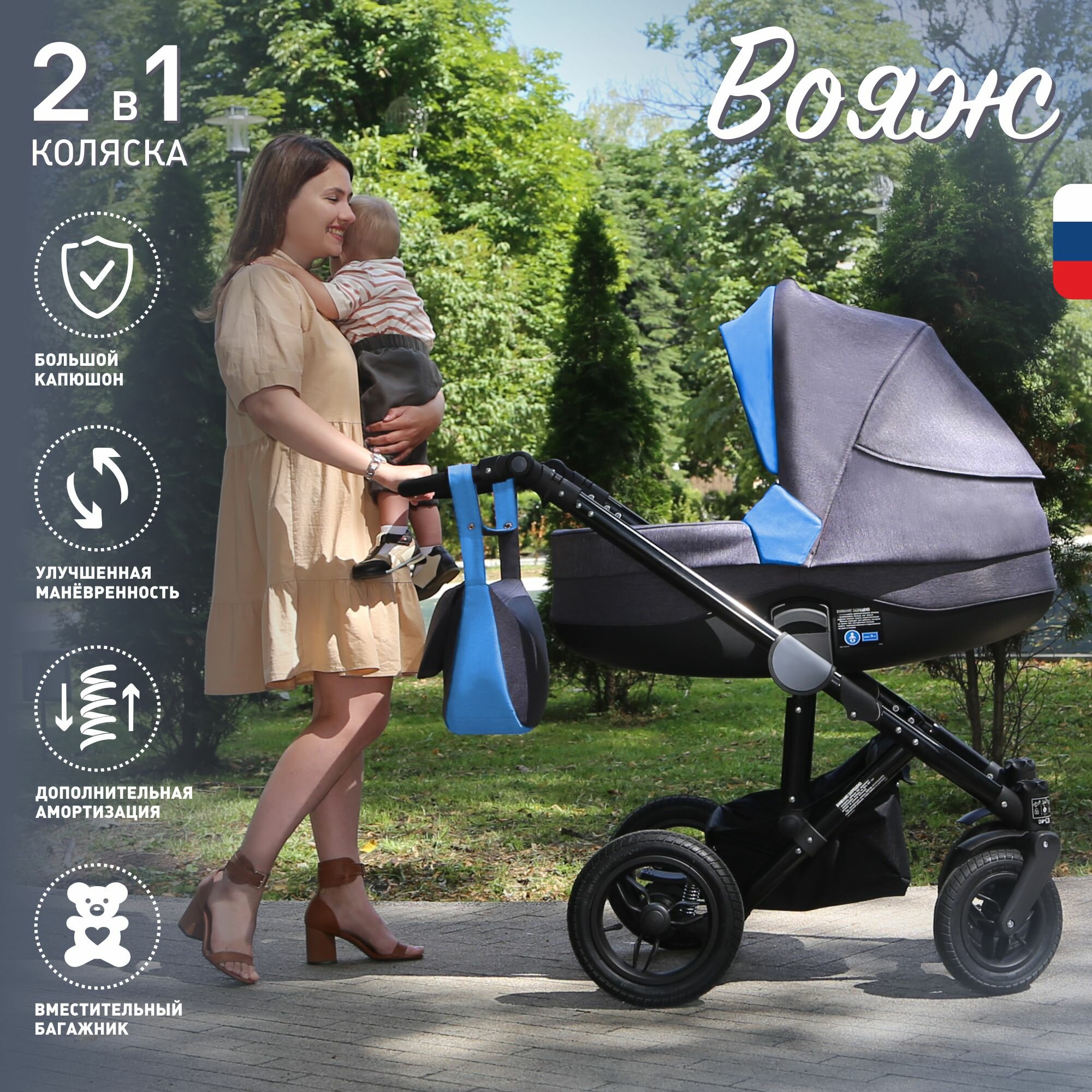 Детская коляска 2 в 1, трансформер, Еду-Еду Вояж, цвет темно-серый/голубой интересное: