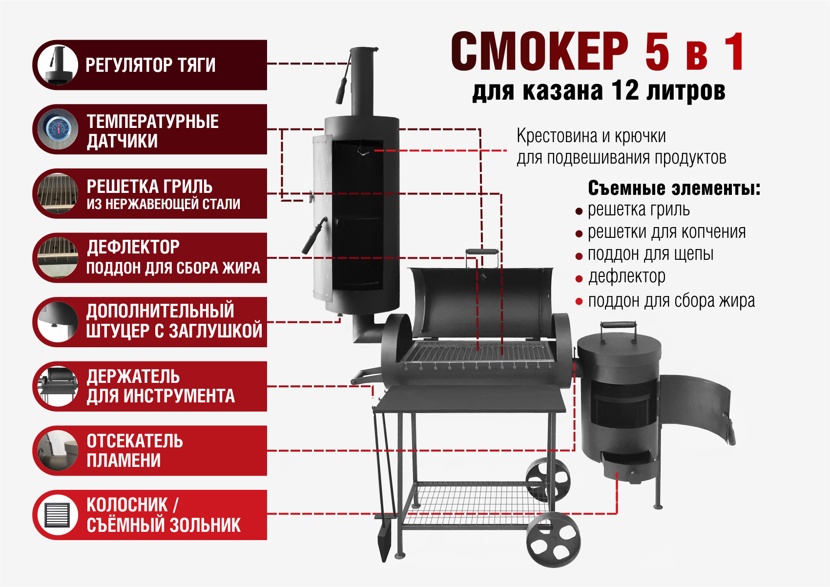 | Особенности | дровница / колёса / крышка / поддон для сбора жира / разборный / решетка / столик / термометр |