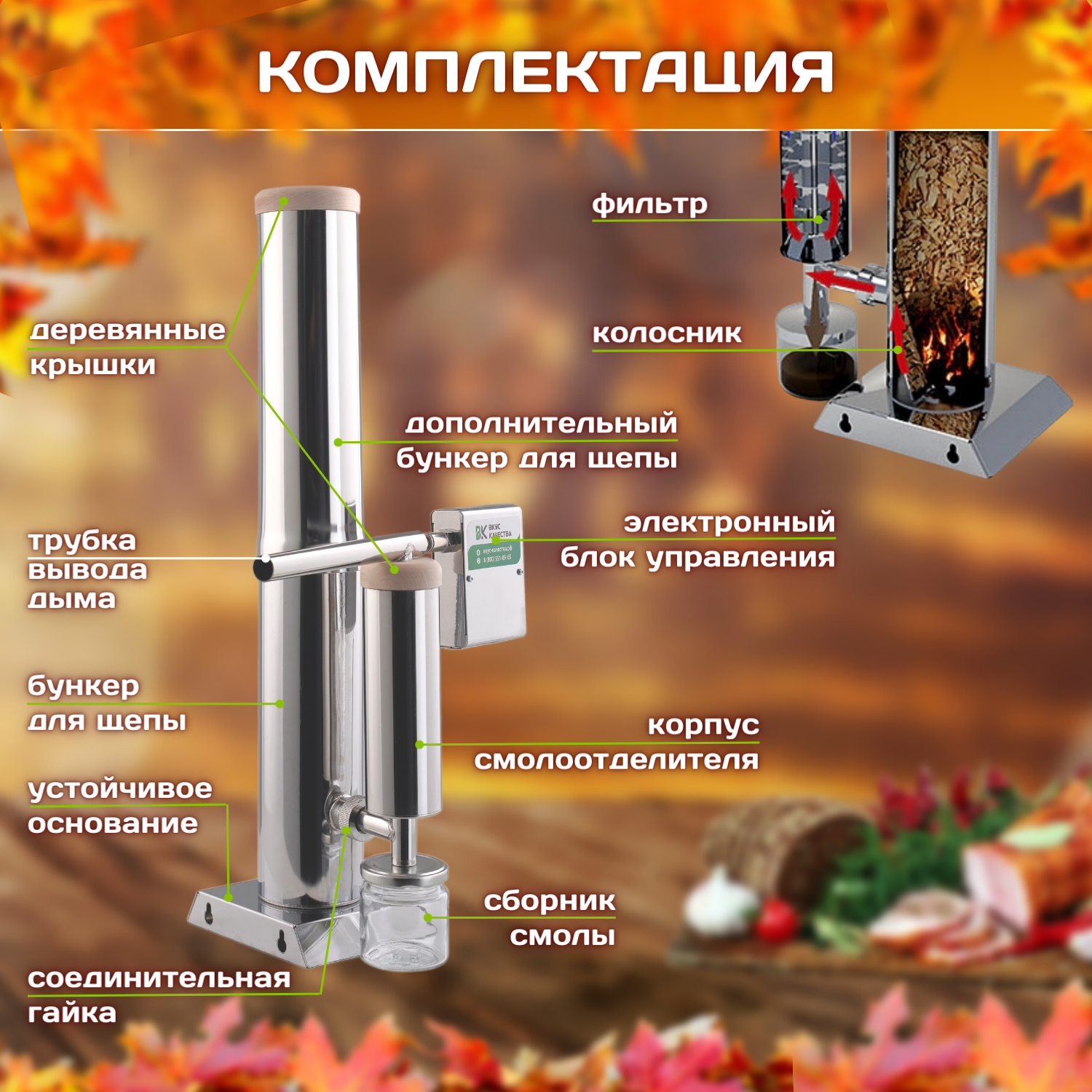 | Дополнительная информация | настройка скорости подачи дыма; автономная работа до 24 часов, без розетки; объем камеры 60 литров, вместимость 10-15 кг |
