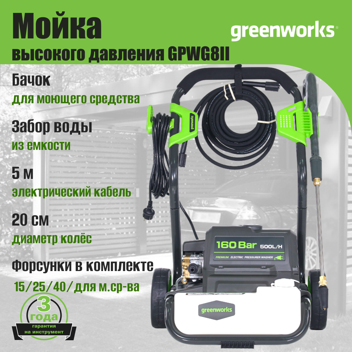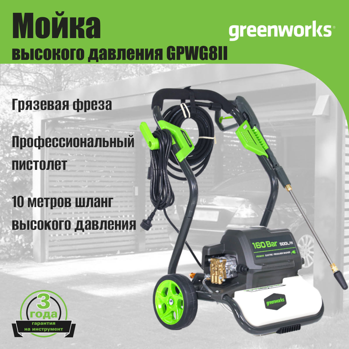 Мойка высокого давления GREENWORKS GPWG8II, 160 бар, 2800 Вт интересное: