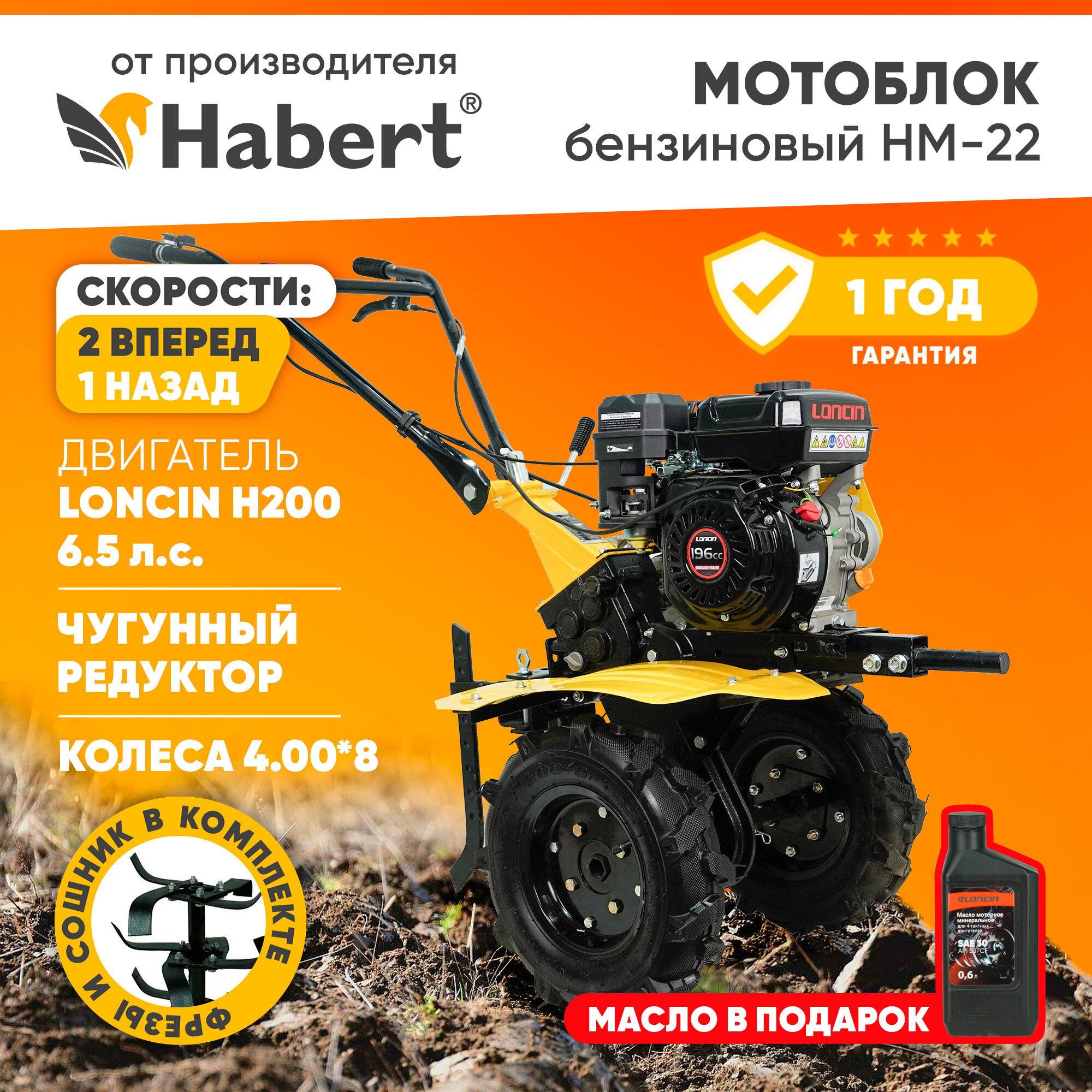 Мотоблок бензиновый Habert HM-22 6.5лс колёса 4.00*8 2 вперед 1 назад шестеренчато-цепной редуктор акция!!! Масло моторное в подарок интересное: