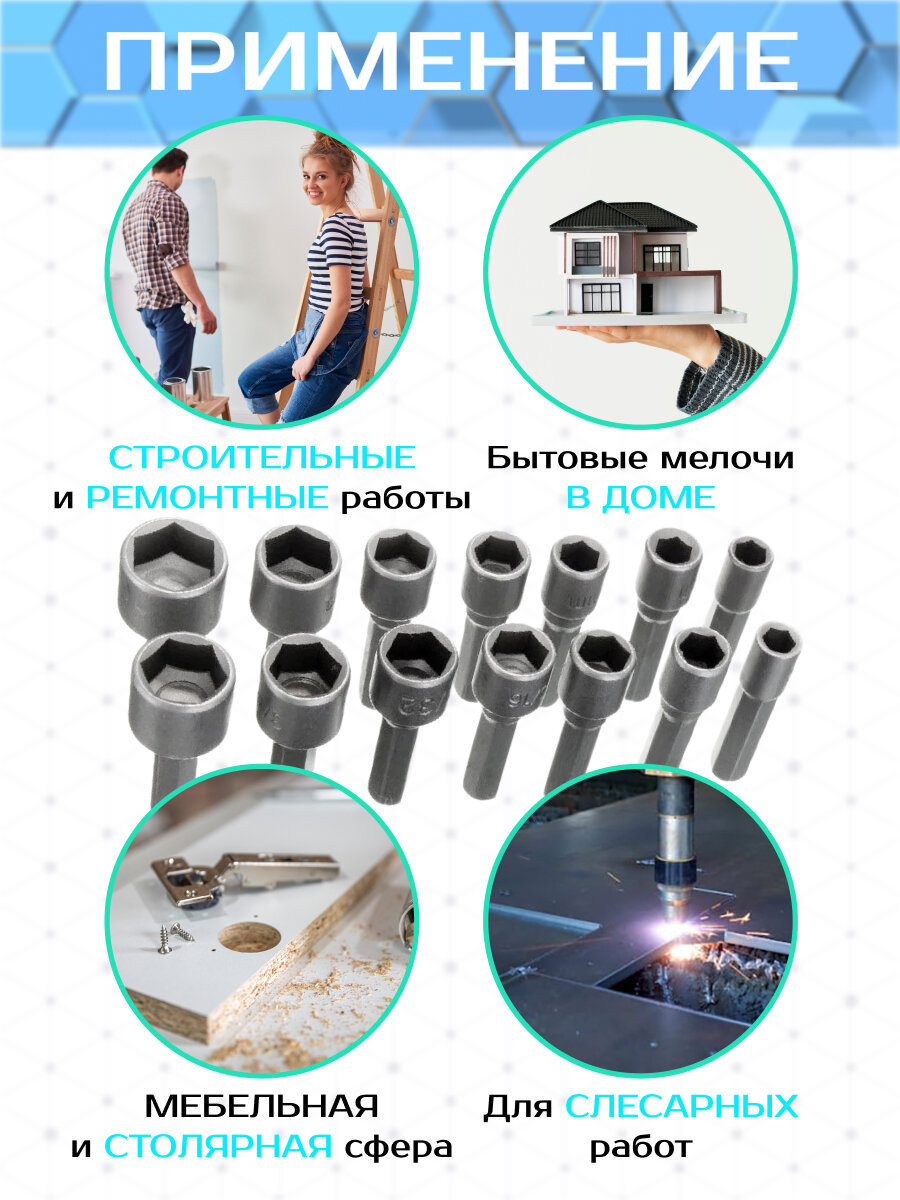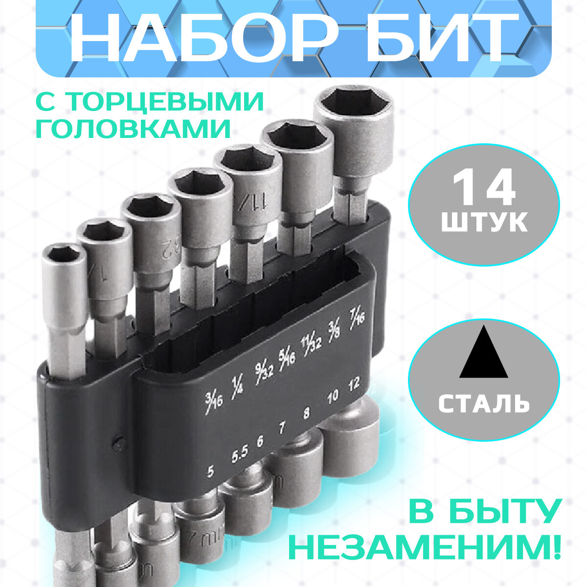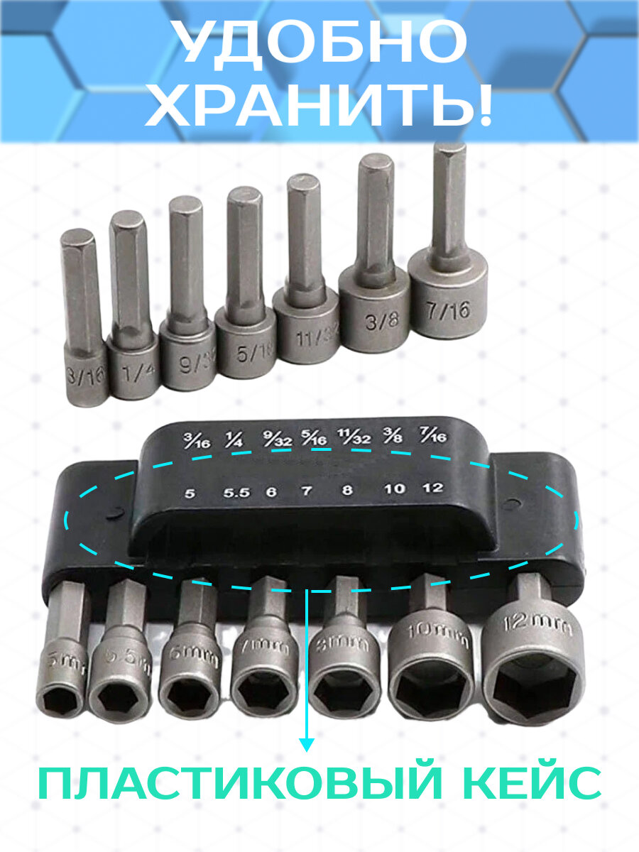 | Биты подробно | 3/16 (4,76 мм), 1/4 (6,35 мм), 9/32 (7,14 мм), 5/16 (7,93 мм), 11/32 (8,73 мм), 3/8 (9,53 мм), 7/16 (11,11 мм), 5 мм, 5,5 мм, 6 мм, 7 мм, 8 мм, 10 мм, 12 мм |