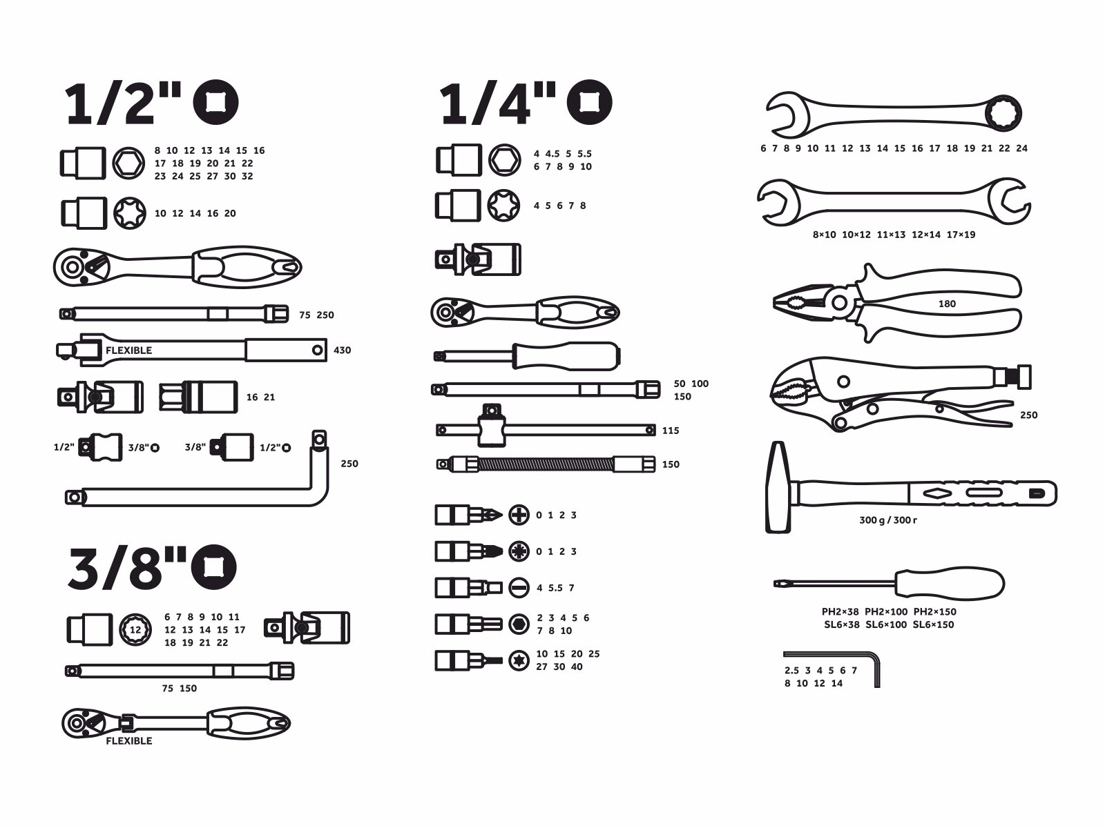| Инструменты в комплекте | вороток для головок / зубила / клещи / ключи имбусовые (шестигранные) / молоток / отвёртки / пассатижи / трещотка |