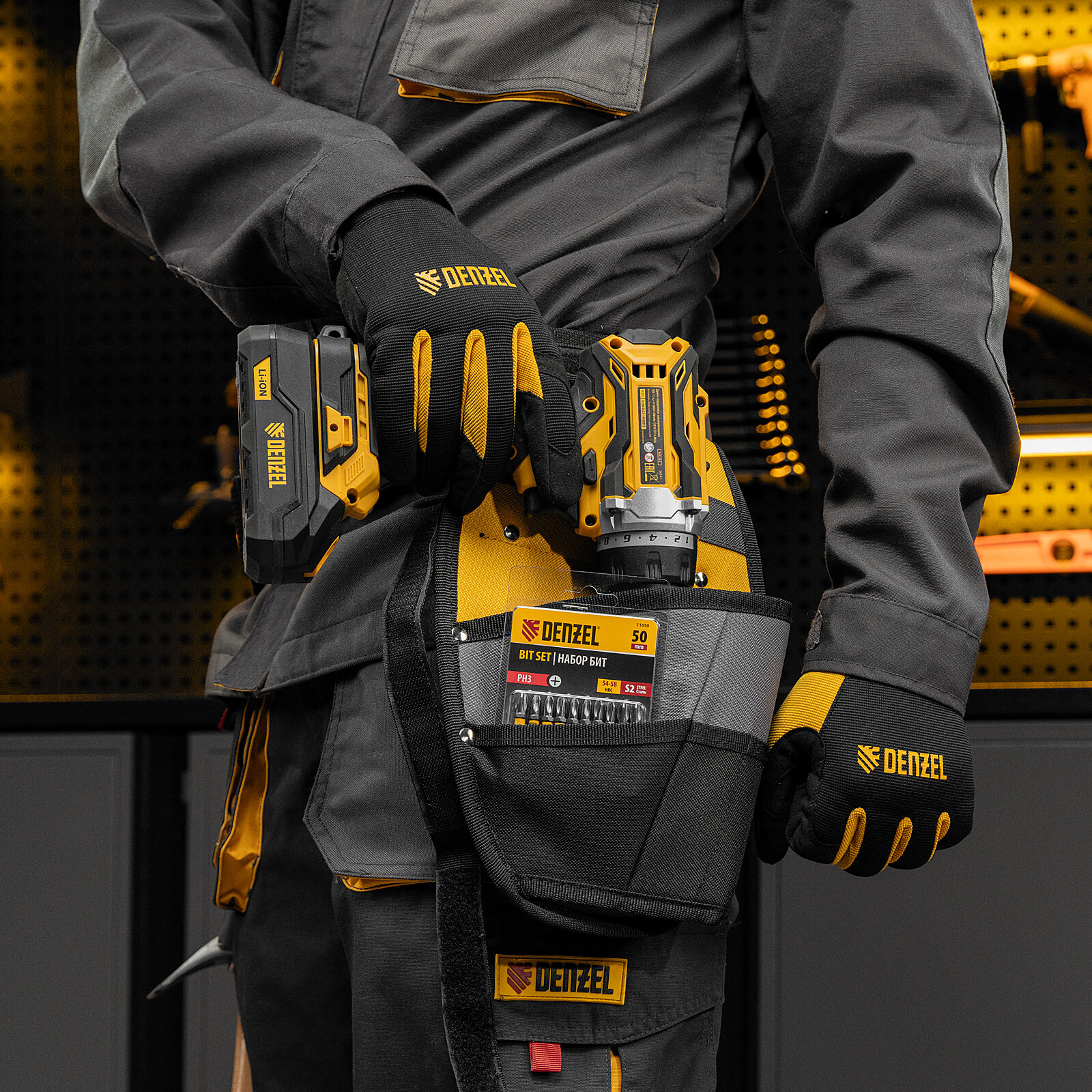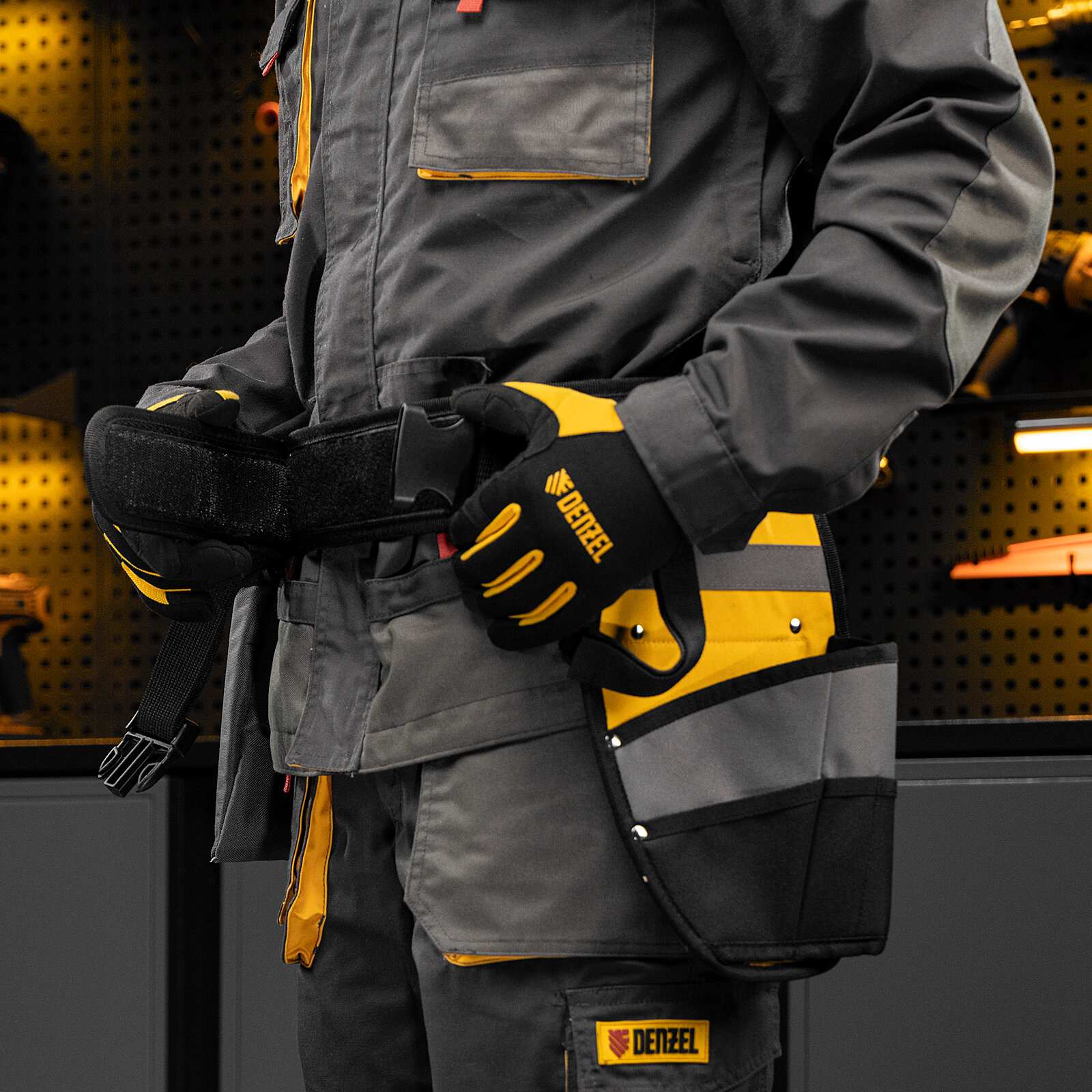 Пояс монтажника усиленный, с лямками, сумки поясные, держатель для молотка// Denzel